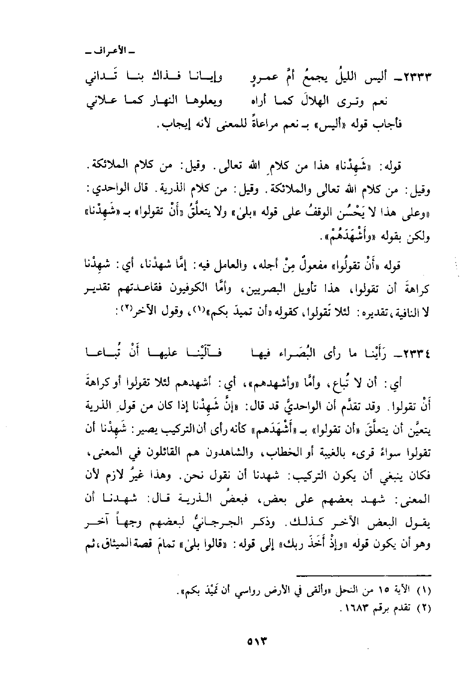 أي: أن لا تُباع، وأمَّا» وأشهدهم «، أي: أشهدهم لئلا تقولوا أو كراهةَ أَنْ تقولوا. وقد تقدَّم أن الواحديَّ قد قال:» إنَّ شَهِدْنا إذا كان من قولِ الذرية يتعيَّن أن يتعلَّقَ «أن تقولوا» ب «أَشْهَدَهم» كأنه رأى أن التركيب يصير: شَهِدْنا أن تقولوا سواءً قرئ بالغيبة أو الخطاب، والشاهدون هم القائلون في المعنى، فكان ينبغي أن يكون التركيب: شهدنا أن نقول نحن. وهذا غيرُ لازم لأن المعنى: شهد بعضهم على بعض، فبعضُ الذرية قال: شهدنا أن يقول البعض الآخر كذلك. وذكر الجرجانيُّ لبعضهم وجهاً آخر وهو أن يكون قوله «وإذْ أخَذَ ربك» إلى قوله: «قالوا بلى» تمامَ قصة الميثاق، ثم