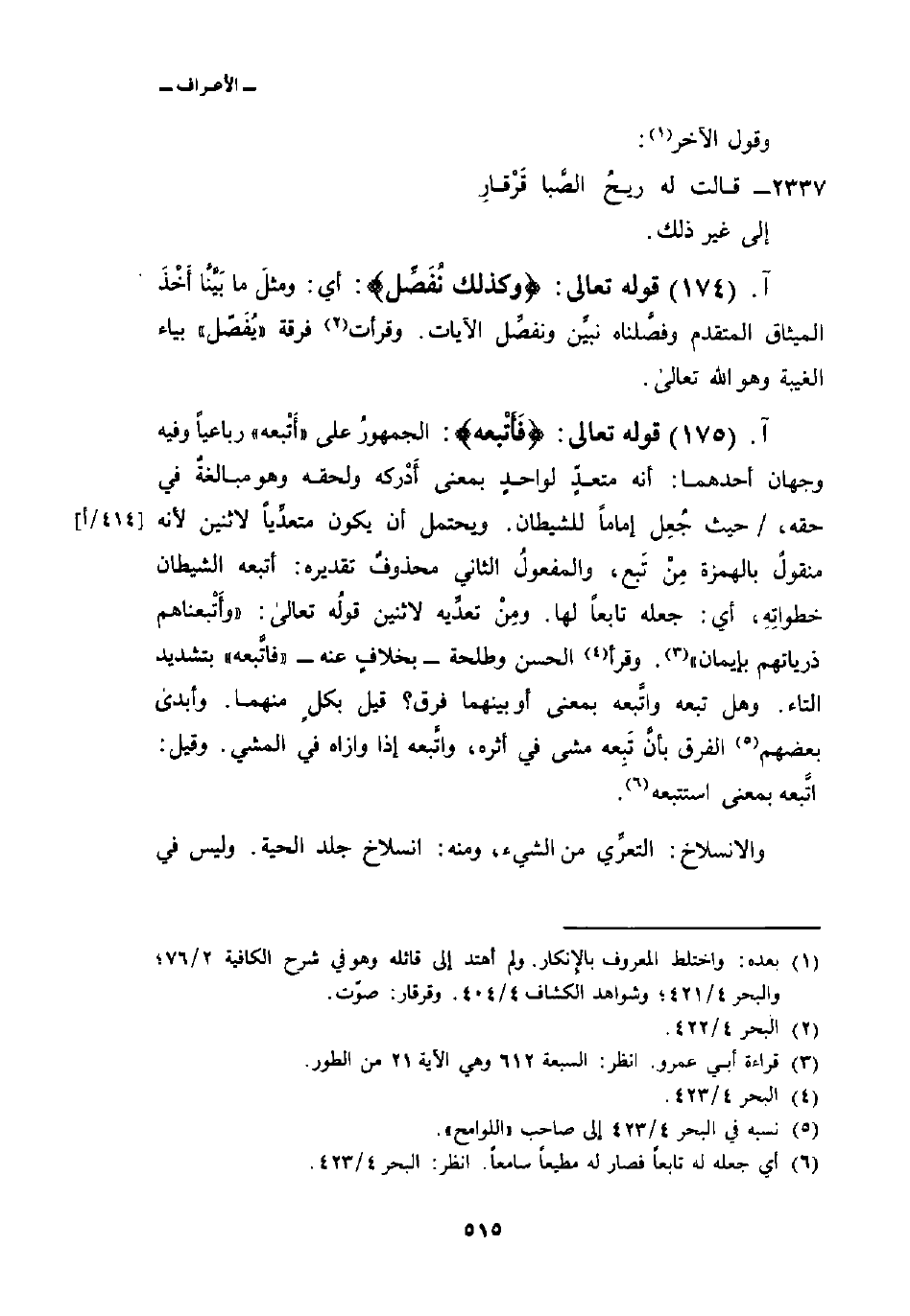 قوله تعالى: {فَأَتْبَعَهُ} : الجمهورُ على «أَتْبعه» رباعياً وفيه وجهان أحدهما: أنه متعدٍّ لواحدٍ بمعنى أَدْركه ولحقه وهو مبالغةٌ في حقه، / حيث جُعِل إماماً للشيطان. ويحتمل أن يكون متعدِّياً لاثنين لأنه منقولٌ بالهمزة مِنْ تَبع، والمفعولُ الثاني محذوفٌ تقديره: أتبعه الشيطان خطواتِهِ، أي: جعله تابعاً لها. ومِنْ تعدِّيه لاثنين قولُه تعالى: {وأَتْبعناهم ذرياتهم بإيمان} [الطور: 21] . وقرأ الحسن وطلحة بخلافٍ عنه «فاتَّبعه» بتشديد التاء. وهل تبعه واتَّبعه بمعنى أو بينهما فرق؟ قيل بكلٍ منهما/ وأبدى بعضهم الفرق بأنَّ تَبِعه مشى في أثره، واتَّبعه إذا وازاه في المشي. وقيل: اتَّبعه بمعنى استتبعه.