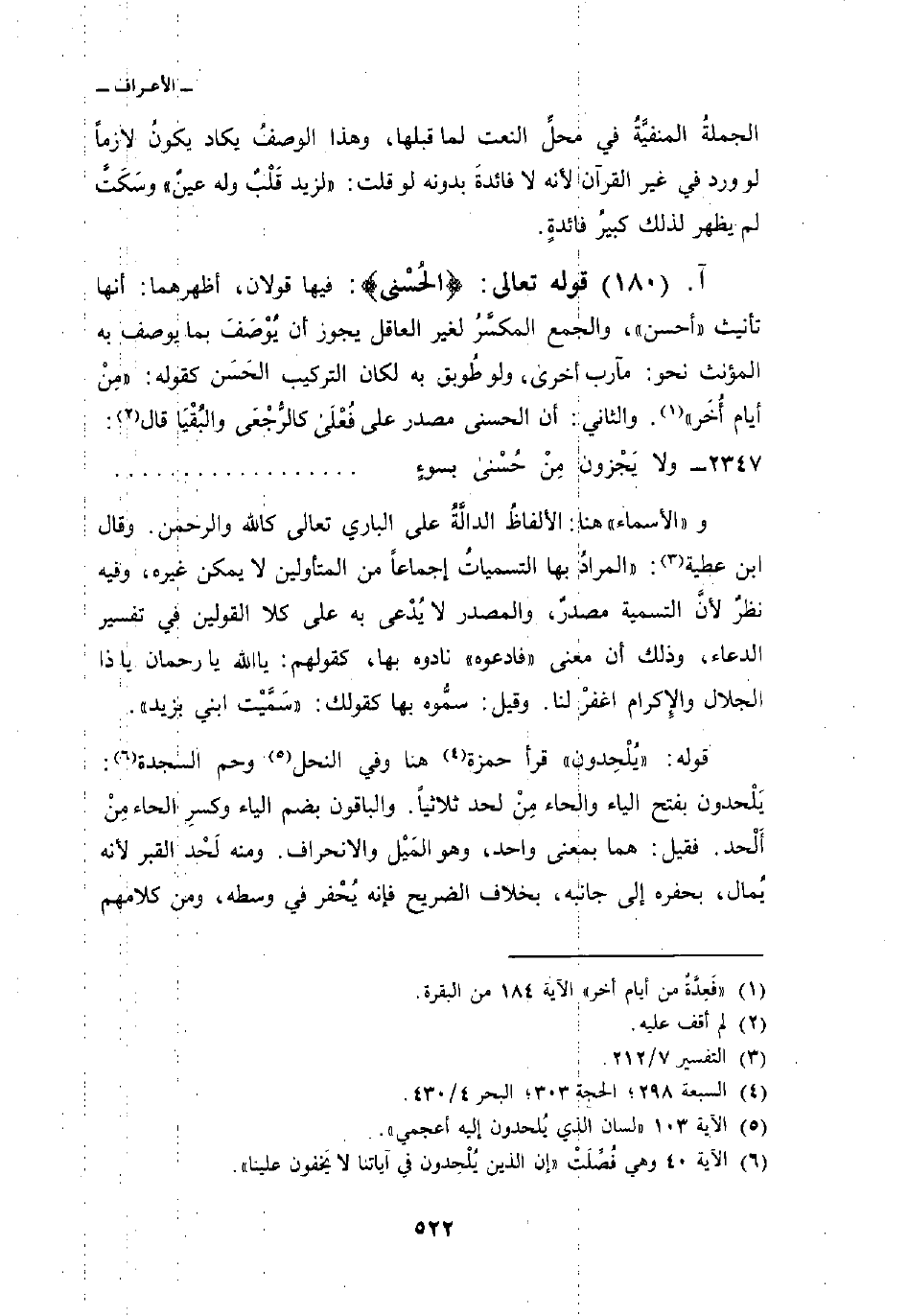 و «الأسماء» هنا: الألفاظُ الدالَّةُ على الباري تعالى كالله والرحمن. وقال ابن عطية: «المرادُ بها التسمياتُ إجماعاً من المتأولين لا يمكن غيره، وفيه نظرٌ لأنَّ التسمية مصدرٌ، والمصدر لا يُدْعى به على كلا القولين في تفسير الدعاء، وذلك أن معنى» فادعوه «نادوه بها، كقولهم: يا الله يا رحمان يا ذا الجلال والإِكرام اغفرْ لنا. وقيل: سمُّوه بها كقولك:» سَمَّيْت ابني بزيد «.