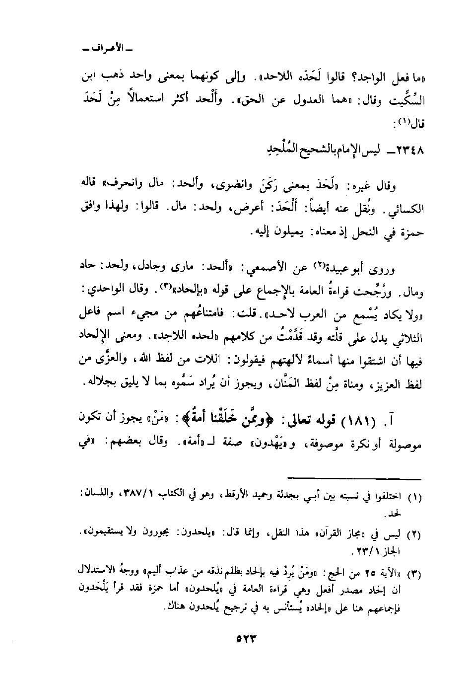 وروى أبو عبيدة عن الأصمعي:» ألحد: مارى وجادل، ولحد: حاد ومال. ورُجِّحت قراءةُ العامة بالإِجماع على قوله «بإلحاد» . وقال الواحدي: «ولا يكاد يُسْمع من العرب لاحد» . قلت: فامتناعُهم من مجيء اسم فاعل الثلاثي يدل على قلَّته وقد قَدَّمْتُ من كلامهم «لحده اللاحِد» . ومعنى الإِلحاد فيها أن اشتقوا منها أسماءً لآلهتهم فيقولون: اللات من لفظ الله، والعزَّى من لفظ العزيز، ومناة مِنْ لفظ المَنَّان، ويجوز أن يُراد سَمَّوه بما لا يليق بجلاله.