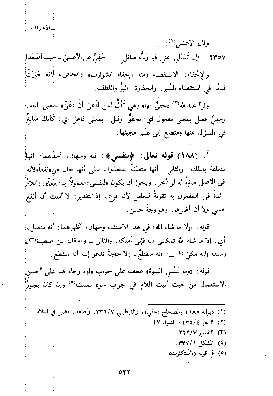 والإِحْفاءُ: الاستقصاء ومنه» إحفاء الشوارب «والحافي، لأنه حَفِيَتْ قدمُه في استقصاء السَّير. والحفاوة: البرُّ واللطف.