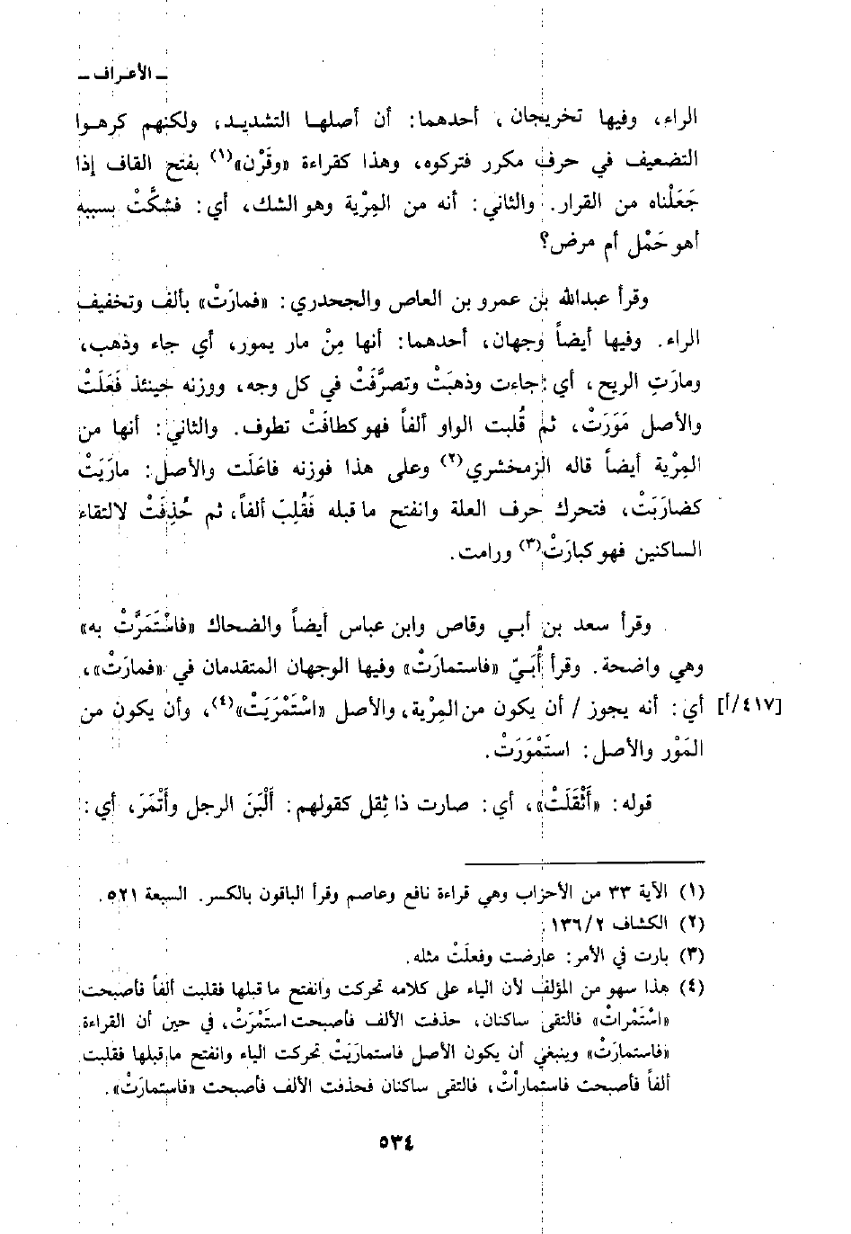 وقرأ سعد بن أبي وقاص وابن عباس أيضاً والضحاك «فاسْتَمَرَّتْ به» وهي واضحة. وقرأ أُبَيّ «فاستمارَتْ» وفيها الوجهان المتقدمان في «فمارَتْ» ، أي: أنه يجوز/ أن يكون من المِرْية، والأصل «اسْتَمْرَيَتْ» ، وأن يكون من المَوْر والأصل: استَمْوَرَتْ.