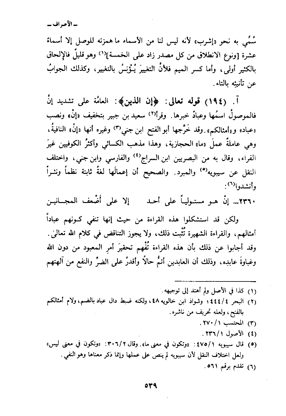 قوله تعالى: {إِنَّ الذين} : العامَّة على تشديد إنَّ فالموصولُ اسمُها وعبادٌ خبرها. وقرأ سعيد بن جبير بتخفيف «إنْ» ونصب «عباد» و «أمثالكم» . وقد خَرَّجها أبو الفتح ابن جني وغيره أنها «إنْ» النافيةُ، وهي عاملةٌ عملَ «ما» الحجازية، وهذا مذهب الكسائي وأكثرُ الكوفيين غيرَ الفراء، وقال به من البصريين ابن السراج والفارسي وابن جني، واختلف النقل عن سيبويه والمبرد. والصحيح أن إعمالَها لغةٌ ثابتة نظماً ونثراً وأنشدوا: