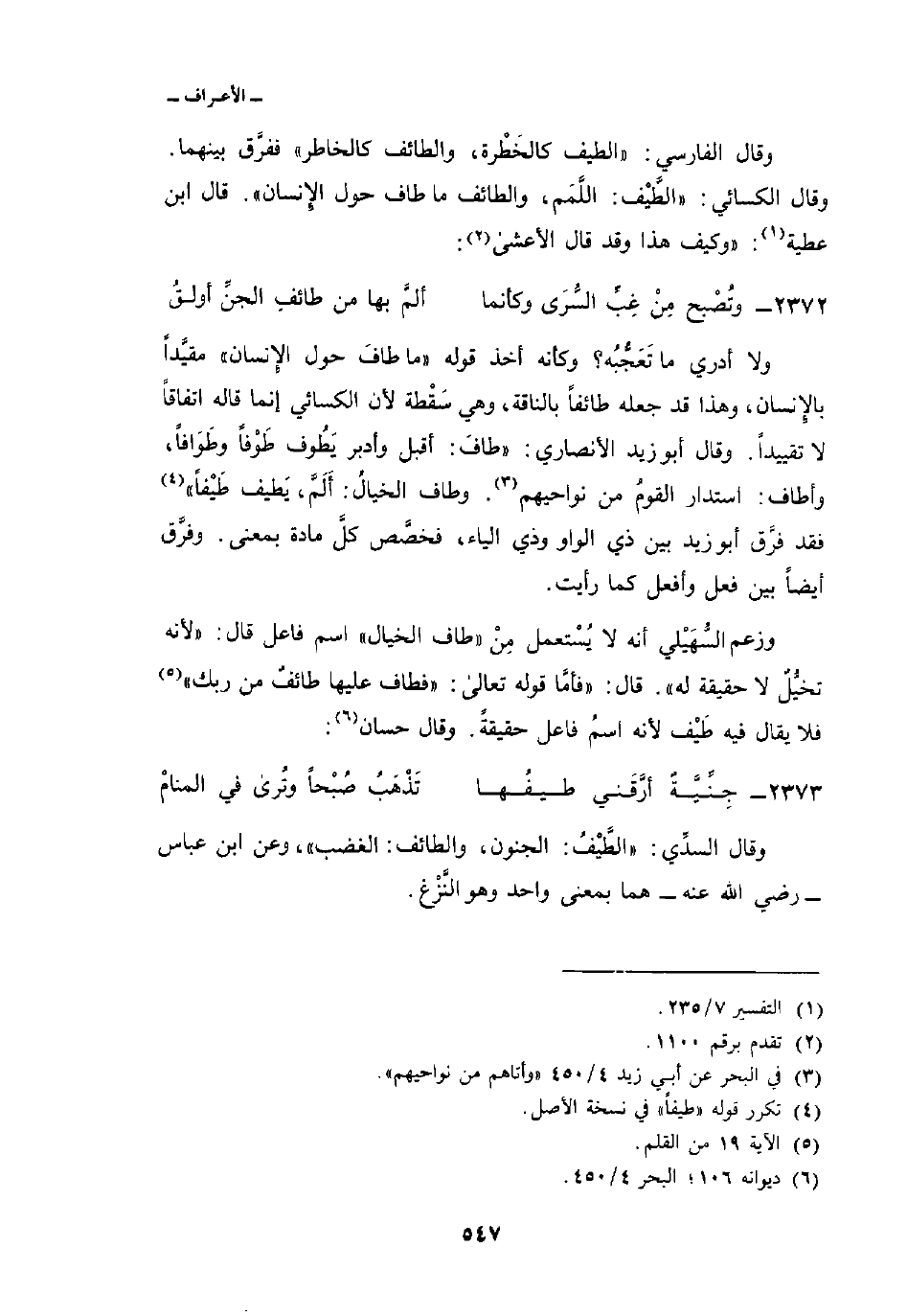وقال الفارسي: «الطيف كالخَطْرة، والطائف كالخاطر» ففرَّق بينهما. وقال الكسائي: «الطَّيْف: اللَّمَم، والطائف ما طاف حول الإِنسان» . قال ابن عطية: «وكيف هذا وقد قال الأعشى: