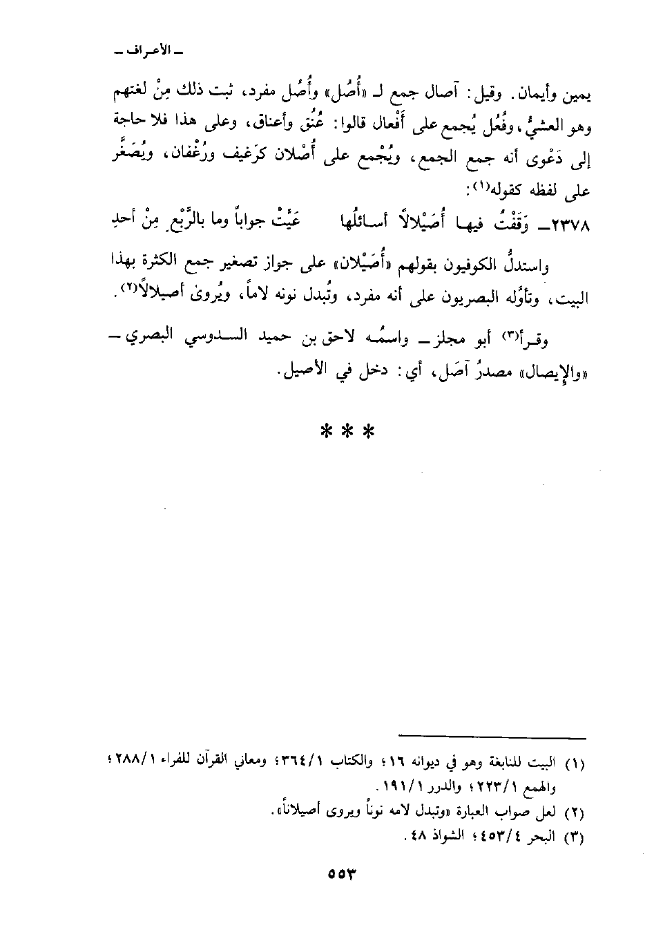 واستدلُّ الكوفيون بقولهم «أُصَيْلان» على جواز تصغير جمع الكثرة بهذا البيت، وتأوَّله البصريون على أنه مفرد، وتُبدل نونه لاماً، ويُروى أصيلالاً.