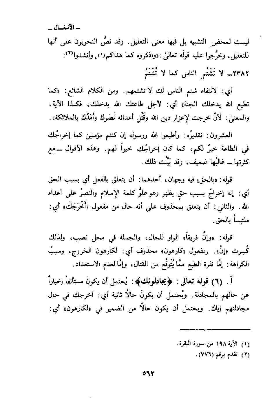 2382 - لا تَشْتُمِ الناس كما لا تُشْتَمُ ... أي: لانتفاء شتم الناس لك لا تشتمهم. ومن الكلام الشائع:» كما تطيع الله يدخلك الجنة «أي: لأجل طاعتك الله يدخلك، فكذا الآية، والمعنى: لأَنْ خرجت لإِعزاز دين الله وقَتْل أعدائه نَصَرك وأَمَدَّك بالملائكة» .