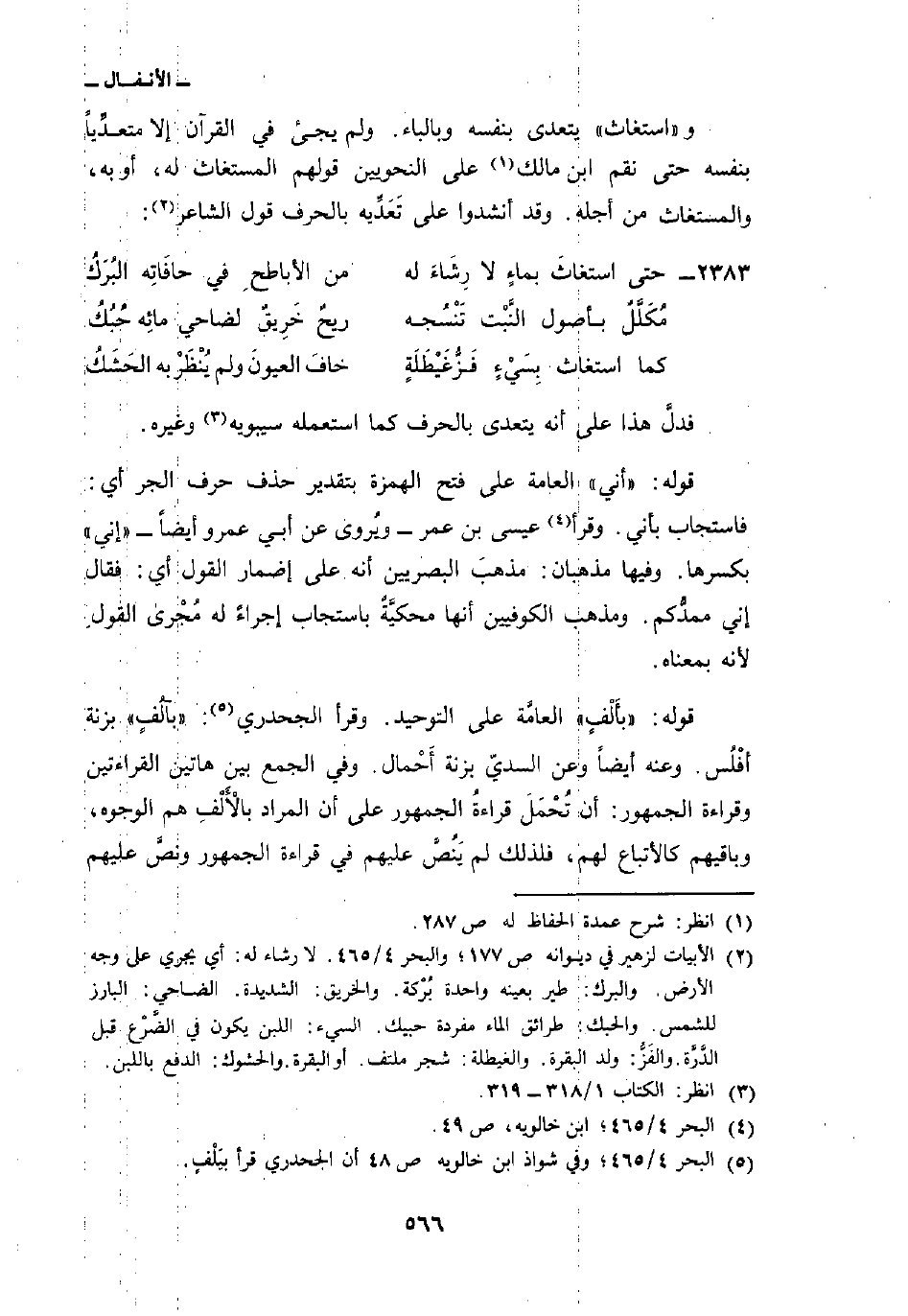 و «استغاث» يتعدى بنفسه وبالباء. ولم يجئ في القرآن إلا متعدِّياً بنفسه حتى نقم ابن مالك على النحويين قولهم المستغاث له، أو به، والمستغاث من أجله. وقد أنشدوا على تَعَدِّيه بالحرف قول الشاعر: