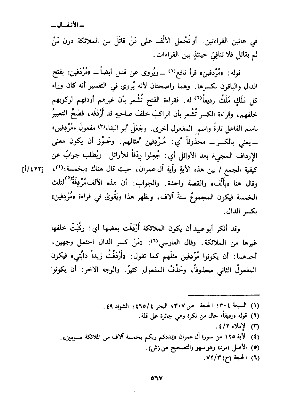 قوله: {مُرْدِفِينَ} قرأ نافع ويُروى عن قنبل أيضاً «مُرْدَفين» بفتح الدال والباقون بكسرها. وهما واضحتان لأنه يُروى في التفسير أنه كان وراء كل مَلِكٍ مَلَكٌ رديفاً له. فقراءة الفتح تُشْعر بأن غيرهم أردفهم لركوبهم خلفهم، وقراءة الكسر تُشْعر بأن الراكبَ خلفَ صاحبهِ قد أَرْدَفَه، فصَحَّ التعبيرُ باسم الفاعل تارةً واسمِ المفعول أخرى. وجَعَلَ أبو البقاء مفعولَ «مُرْدِفين» يعني بالكسر محذوفاً أي: مُرْدِفين أمثالهم. وجَوَّز أن يكون معنى الإِرداف المجيءَ بعد الأوائل أي: جُعِلوا رِدْفاً للأوائل.