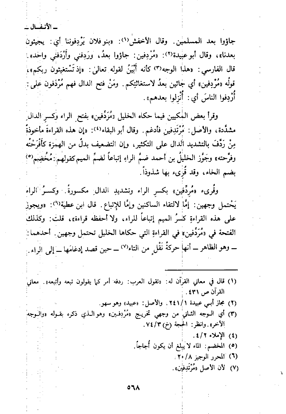 وقُرئ» مُرِدِّفين «بكسرِ الراء وتشديدِ الدالِ مكسورةً. وكسرُ الراء يَحْتمل وجهين: إمَّا لالتقاء الساكنين وإمَّا للإِتباع. قال ابن عطية:» ويجوز على هذه القراءةِ كسرُ الميم إتباعاً للراء، ولا أحفظه قراءة «، قلت: وكذلك الفتحة في» مُرَدِّفين «في القراءةِ التي حكاها الخليل تحتمل وجهين. أحدهما: وهو الظاهر أنها حركةُ نَقْلٍ من التاء حين قصد إدغامَها إلى الراء.