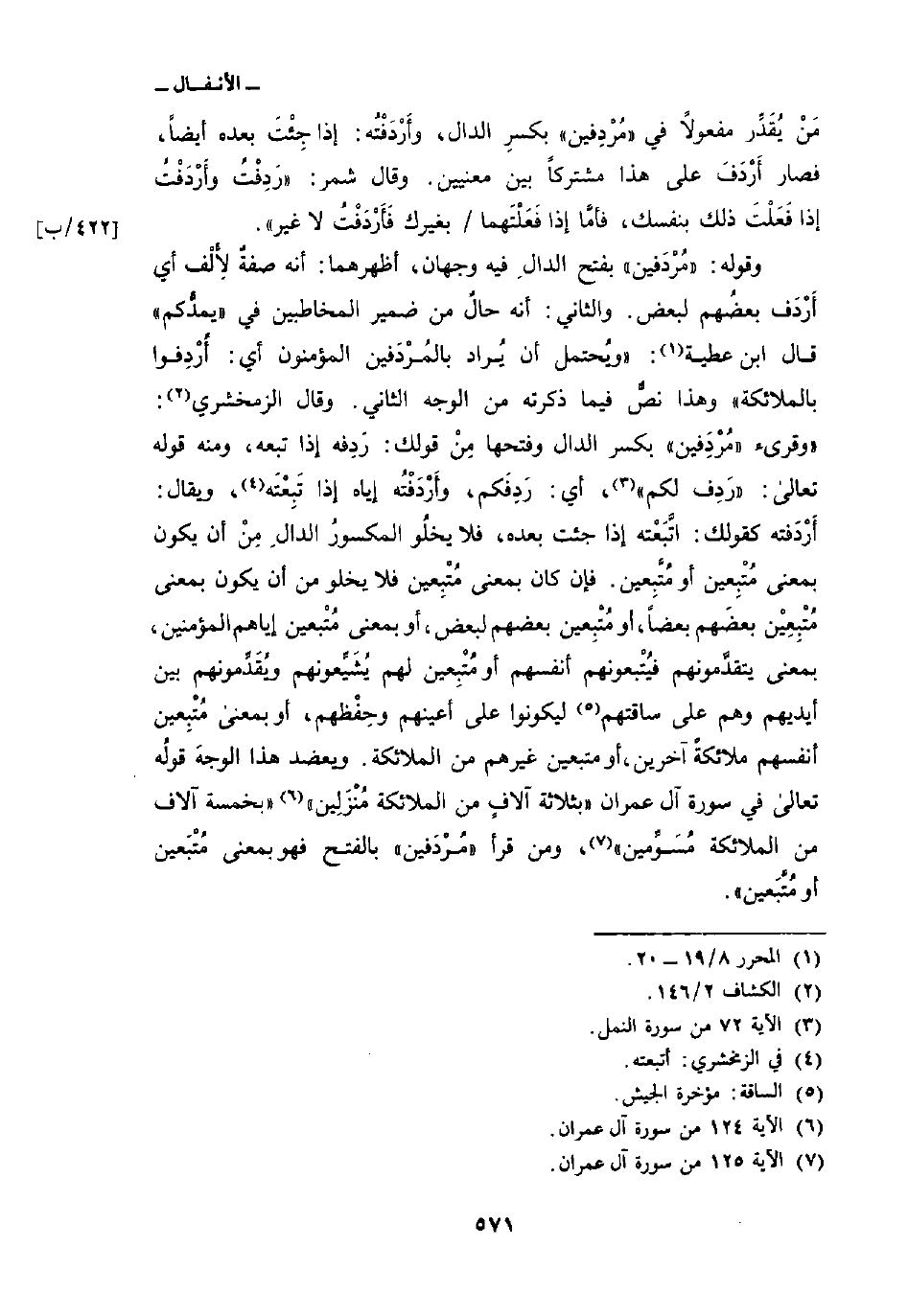 {بثلاثة آلافٍ من الملائكة منزلين} [آل عمران: 124] {بِخَمْسَةِ آلاف مِّنَ الملائكة مُسَوِّمِينَ} [آل عمران: 125] ، ومن قرأ «مُرْدَفين» بالفتح فهو بمعنى مُتْبَعين أو مُتَّبَعين «.