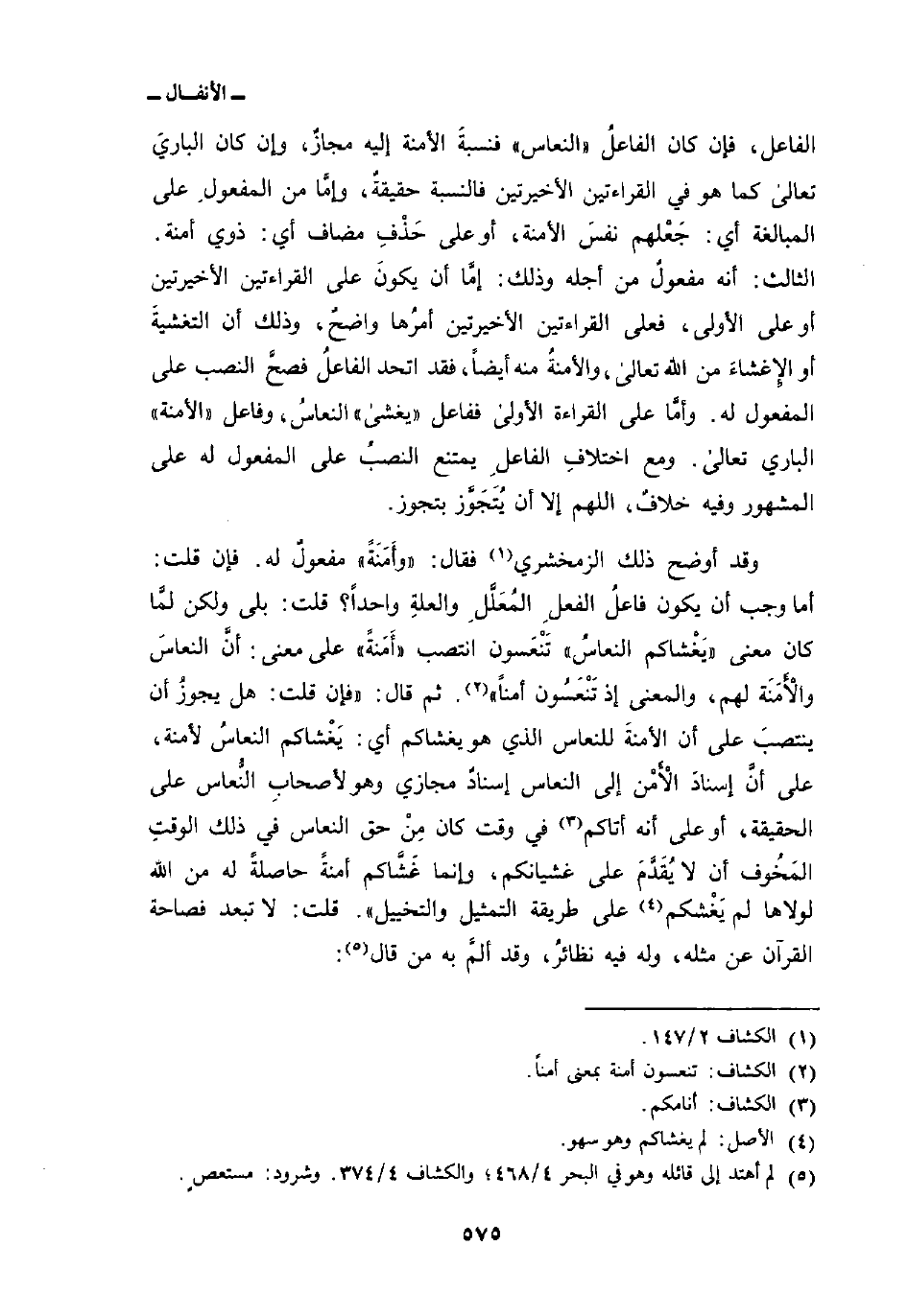 وقد أوضح ذلك الزمخشري فقال: «وأَمَنَةً» مفعولٌ له. فإن قلت: أما وجب أن يكون فاعلُ الفعلِ المُعَلَّلِ والعلةِ واحداً؟ قلت: بلى ولكن لمَّا كان معنى «يَغْشاكم النعاسُ» تَنْعَسون انتصب «أَمَنةً» على معنى: أنَّ النعاسَ والأَمَنَة لهم، والمعنى إذ تَنْعَسُون أمناً «. ثم قال:» فإن قلت: هل يجوزُ أن ينتصبَ على أن الأمنةَ للنعاس الذي هو يغشاكم أي: يَغْشاكم النعاسُ لأمنة، على أنَّ إسنادَ الأَمْن إلى النعاس إسنادٌ مجازي وهو لأصحابِ النُّعاس على الحقيقة، أو على أنه أتاكم في وقت كان مِنْ حق النعاس في ذلك الوقت المَخُوف أن لا يُقَدَّمَ على غشيانكم، وإنما غَشَّاكم أمنةً حاصلةً له من الله لولاها لم يَغْشكم على طريقة التمثيل والتخييل «. قلت: لا تبعد فصاحة القرآن عن مثله، وله فيه نظائرُ، وقد ألمَّ به من قال: