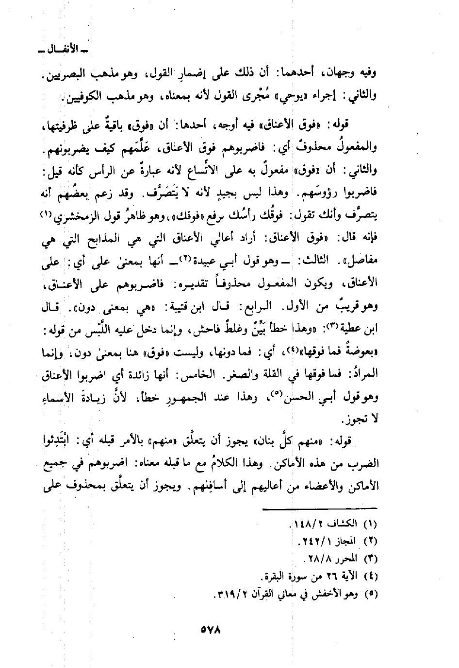 وفيه وجهان، أحدهما: أن ذلك على إِضمارِ القول، وهو مذهب البصريين. والثاني: إجراء «يوحي» مُجْرى القول لأنه بمعناه، وهو مذهب الكوفيين. قوله: {فَوْقَ الأعناق} فيه أوجه، أحدها: أن «فوق» باقيةٌ على ظرفيتها، والمفعولُ محذوفٌ أي: فاضربوهم فوق الأعناق، عَلَّمَهم كيف يضربونهم. والثاني: أن «فوق» مفعولٌ به على الاتِّساع لأنه عبارةٌ عن الرأس كأنه قيل: فاضربوا رؤوسَهم. وهذا ليس بجيدٍ لأنه لا يَتَصَرَّف. وقد زعم بعضُهم أنه يتصرَّف وأنك تقول: فوقُك رأسُك برفع «فوقك» ، وهو ظاهرُ قول الزمخشري فإنه قال: «فوق الأعناق: أراد أعالي الأعناق التي هي المذابح التي هي مفاصل» . الثالث: وهو قول أبي عبيدة أنها بمعنى على أي: على الأعناق، ويكون المفعول محذوفاً تقديره: فاضربوهم على الأعناق، وهو قريبٌ من الأول. الرابع: قال ابن قتيبة: «هي بمعنى دون» . قال ابن عطية: «وهذا خطأ بَيِّنٌ وغلطٌ فاحش، وإنما دخل عليه اللَّبْس من قوله: {بَعُوضَةً فَمَا فَوْقَهَا} [البقرة: 26] ، أي: فما دونها، وليست» فوق «هنا بمعنى دون، وإنما المرادُ: فما فوقها في القلة والصغر. الخامس: أنها زائدة أي اضربوا الأعناق وهو قول أبي الحسن، وهذا عند الجمهورِ خطأ، لأنَّ زيادةَ الأسماءِ لا تجوز.