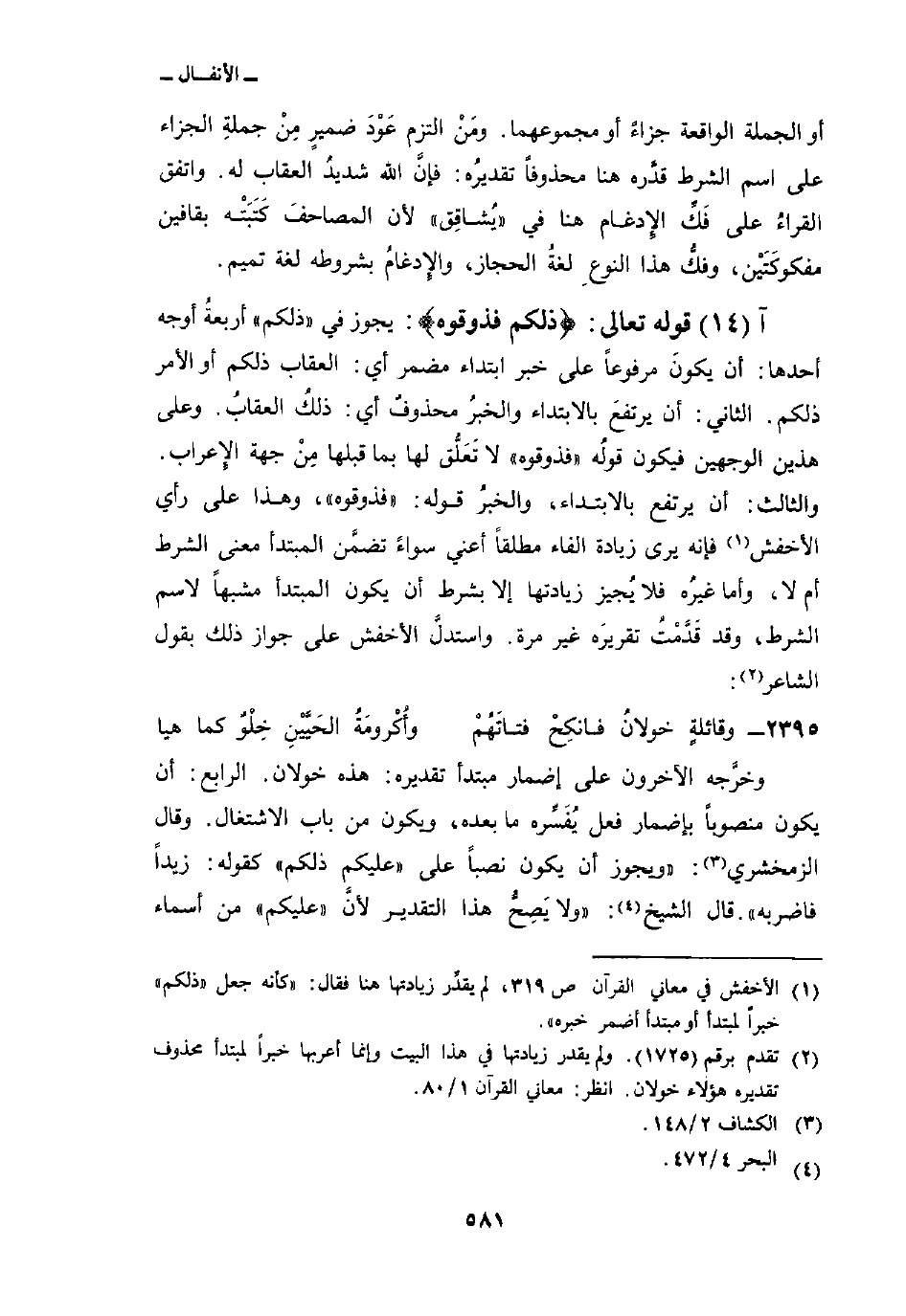 وخرَّجه الآخرون على إضمار مبتدأ تقديره: هذه خولان. الرابع: أن يكون منصوباً بإضمار فعل يُفَسِّره ما بعده، ويكون من باب الاشتغال. وقال الزمخشري: ويجوز أن يكون نصباً على «عليكم ذلكم» كقوله: زيداً فاضربه «. قال الشيخ:» ولا يَصِحُّ هذا التقدير لأنَّ «عليكم» من أسماء