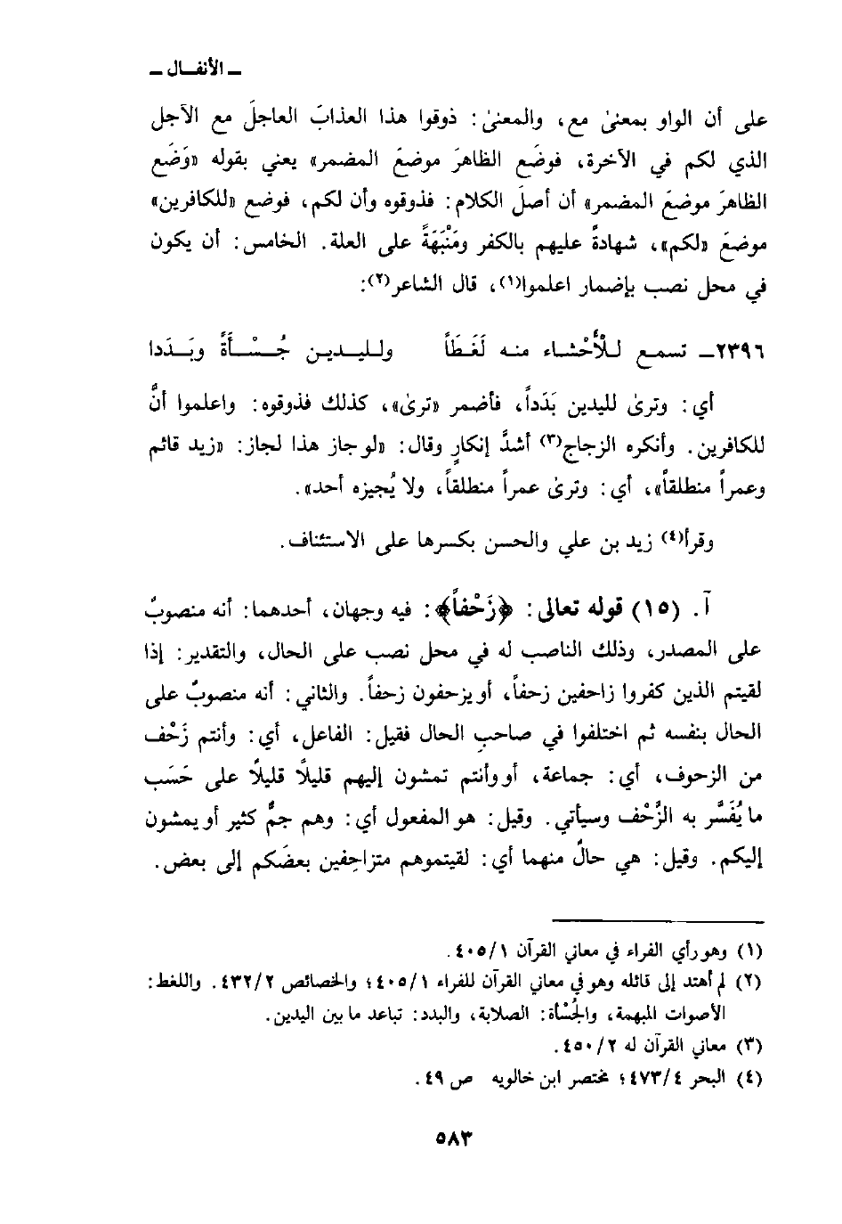 قوله تعالى: {زَحْفاً} : فيه وجهان: أحدهما: أنه منصوبٌ على المصدر، وذلك الناصب له في محل نصب على الحال، والتقدير: إذا لقيتم الذين كفروا زاحفين زحفاً، أو يزحفون زحفاً. والثاني: أنه منصوبٌ على الحال بنفسه ثم اختلفوا في صاحبِ الحال فقيل: الفاعل، أي: وأنتم زَحْف من الزحوف، أي: جماعة، أو وأنتم تمشون إليهم قليلاً قليلاً على حَسَب ما يُفَسَّر به الزَّحْف وسيأتي. وقيل: هو المفعول أي: وهم جمٌّ كثير أو يمشون إليكم. وقيل: هي حالٌ منهما أي: لقيتموهم متزاحِفين بعضَكم إلى بعض.