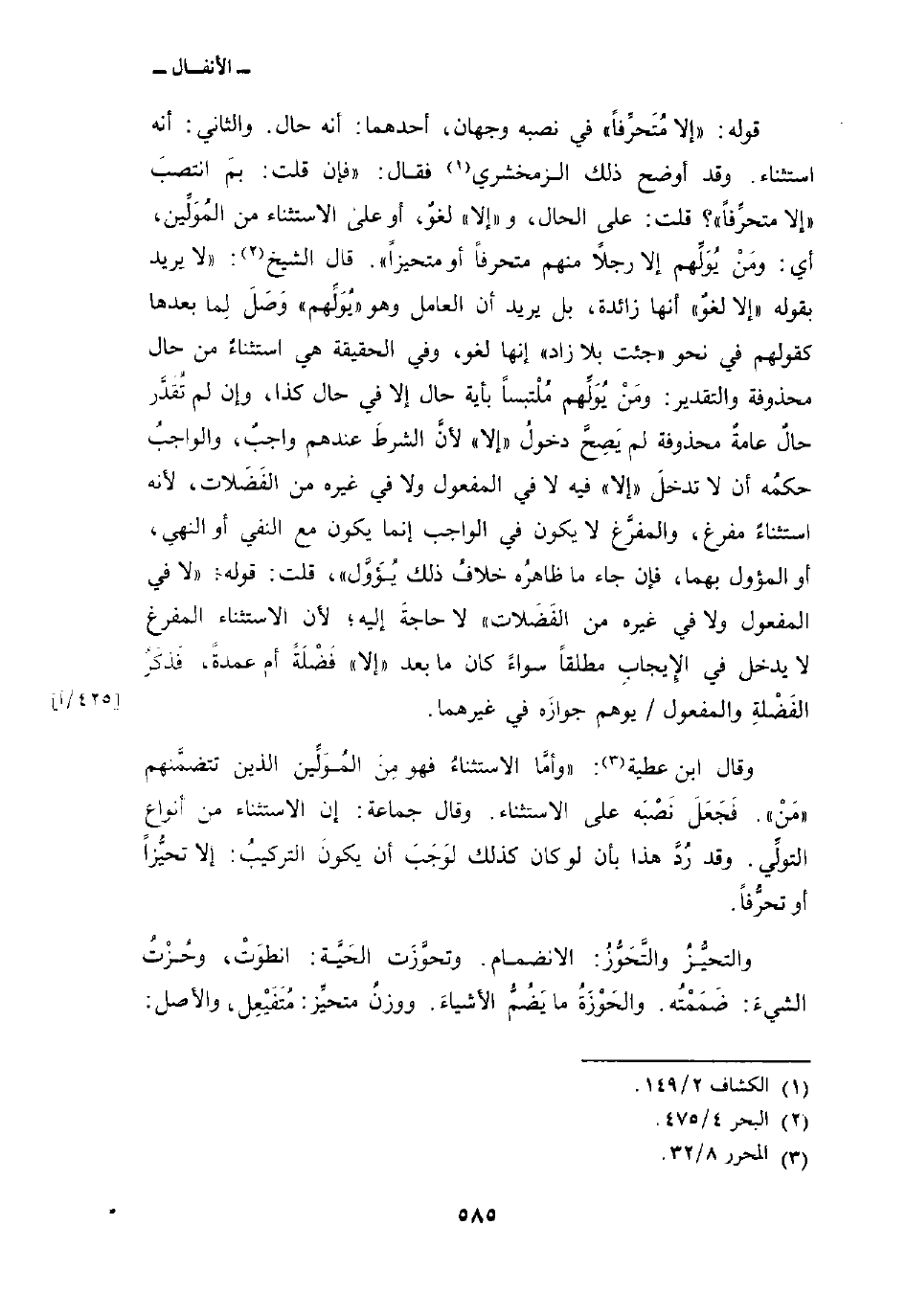 وقال ابن عطية: «وأمَّا الاستثناءُ فهو مِنَ المُوَلِّين الذين تتضمَّنهم» مَنْ «. فَجَعَلَ نَصْبَه على الاستثناء. وقال جماعة: إن الاستثناء من أنواع التولِّي. وقد رُدَّ هذا بأن لو كان كذلك لوَجَبَ أن يكونَ التركيبُ: إلا تحيُّزاً أو تحرُّفاً.