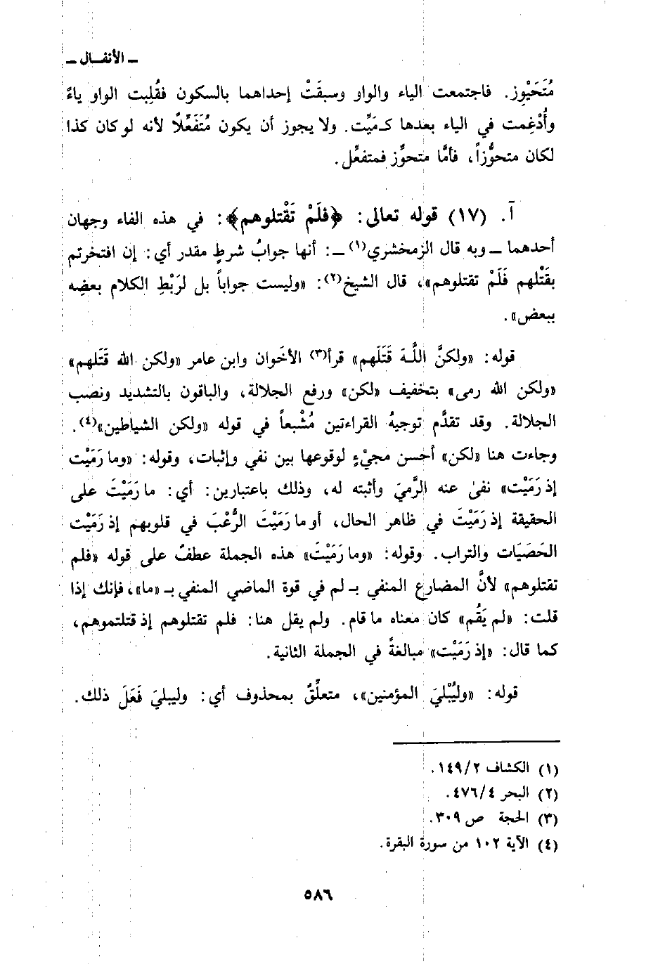 قوله تعالى: {فَلَمْ تَقْتُلُوهُمْ} : في هذه الفاء وجهان أحدهما وبه قال الزمخشري: أنها جوابُ شرطٍ مقدر أي: إن افتخرتم بقَتْلهم فَلَمْ تقتلوهم «، قال الشيخ:» وليست جواباً بل لرَبْطِ الكلام بعضِه ببعض «.