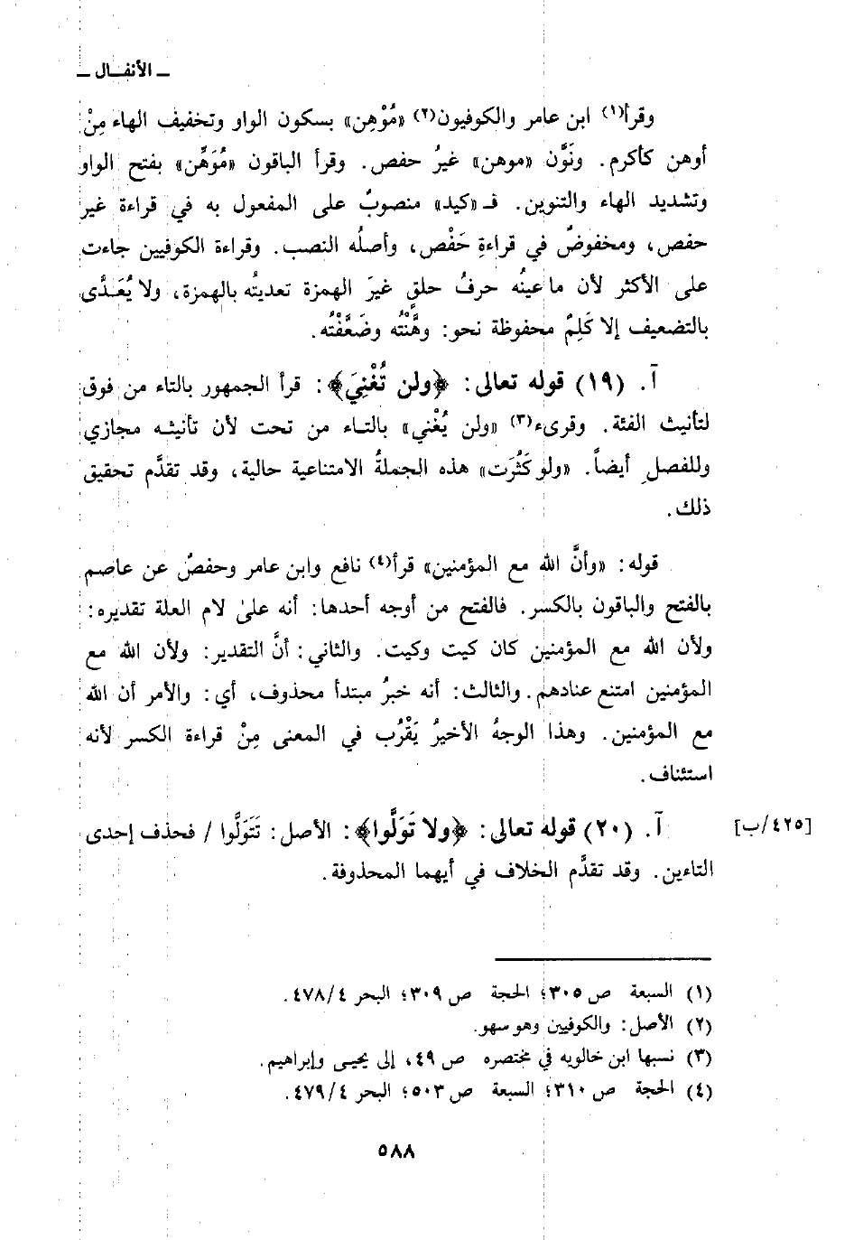 قوله: {وَأَنَّ الله مَعَ المؤمنين} قرأ نافع وابن عامر وحفصٌ عن عاصم بالفتح والباقون بالكسر. فالفتح من أوجه أحدها: أنه على لام العلة تقديره: ولأن الله مع المؤمنين كان كيت وكيت. والثاني: أنَّ التقدير: ولأن الله مع المؤمنين امتنع عنادهم. والثالث: أنه خبرُ مبتدأ محذوف، أي: والأمر أن الله مع المؤمنين. وهذا الوجهُ الأخيرُ يَقْرُب في المعنى مِنْ قراءة الكسر لأنه استئناف.