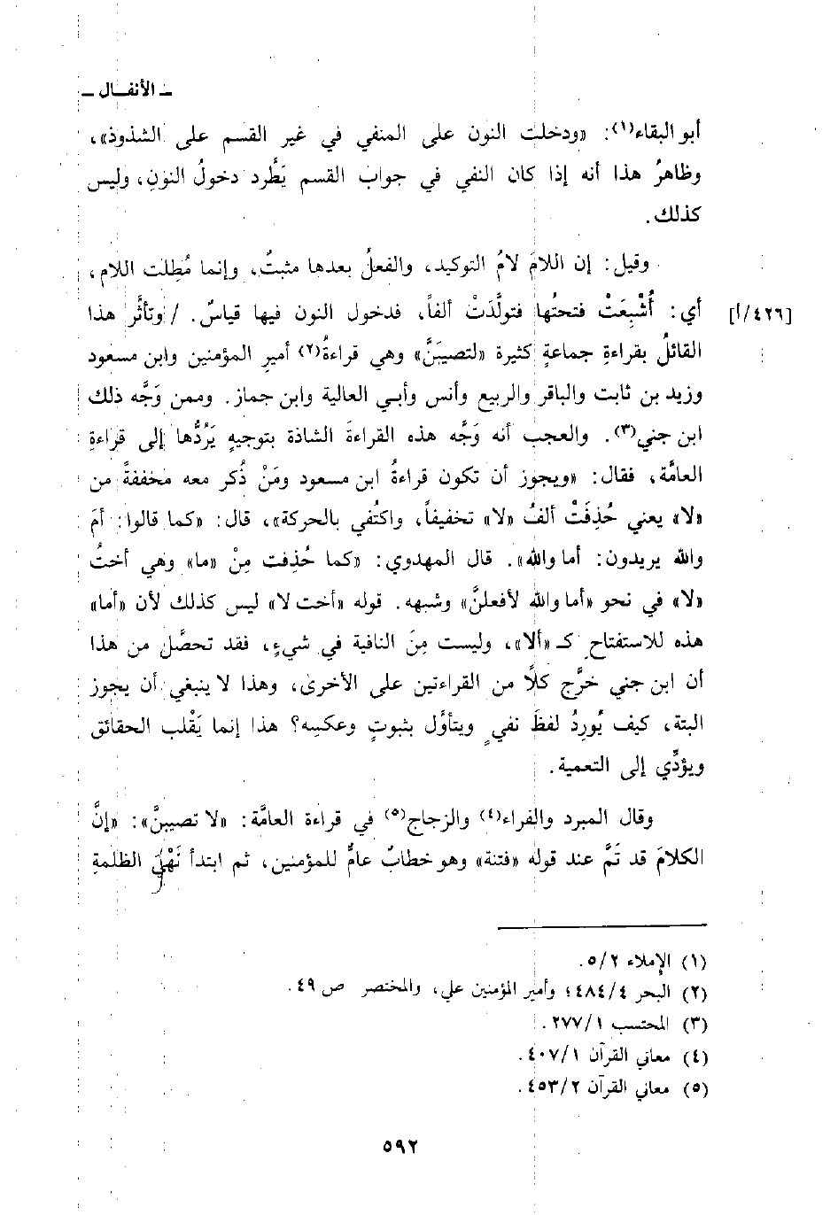 وقيل: إن اللامَ لامُ التوكيد، والفعلُ بعدها مثبتٌ، وإنما مُطِلت اللام، أي: أُشْبِعَتْ فتحتُها فتولَّدَتْ ألفاً، فدخول النون فيها قياسٌ. / وتأثَّر هذا القائلُ بقراءةِ جماعةٍ كثيرة» لتصيبَنَّ «وهي قراءةُ أميرِ المؤمنين وابن مسعود وزيد بن ثابت والباقر والربيع وأنس وأبي العالية وابن جماز. وممن وَجَّه ذلك ابن جني. والعجب أنه وَجَّه هذه القراءةَ الشاذة بتوجيهٍ يَرُدُّها إلى قراءةِ العامَّة، فقال:» ويجوز أن تكون قراءةُ ابن مسعود ومَنْ ذُكر معه مخففةً من «لا» يعني حُذِفَتْ ألفُ «لا» تخفيفاً، واكتُفي بالحركة «، قال:» كما قالوا: أمَ والله يريدون: أما والله «. قال المهدوي:» كما حُذِفت مِنْ «ما» وهي أختُ «لا» في نحو «أما والله لأفعلنَّ» وشبهه. قوله «أخت لا» ليس كذلك لأن «أما» هذه للاستفتاحِ ك «ألا» ، وليست مِنَ النافية في شيءٍ، فقد تحصَّل من هذا أن ابن جني خرَّج كلاً من القراءتين على الأخرى، وهذا لا ينبغي أن يجوز البتة، كيف يُورِدُ لفظَ نفيٍ ويتأوَّل بثبوتٍ وعكسِه؟ هذا إنما يَقْلب الحقائق ويؤدِّي إلى التعمية.