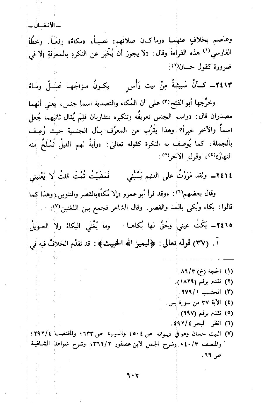 وخرَّجها أبو الفتح على أن المُكاء والتصدية اسما جنس، يعني أنهما مصدران قال:» واسم الجنس تعريفُه وتنكيره متقاربان فلِمَ يُقال ثانيهما جُعل اسماً والآخر خبراً؟ وهذا يَقْرُب من المعرَّف بأل الجنسية حيث وُصِف بالجملة، كما يُوصف به النكرة كقوله تعالى: {وَآيَةٌ لَّهُمُ الليل نَسْلَخُ مِنْهُ النهار} [يس: 37] ، وقولِ الآخر: