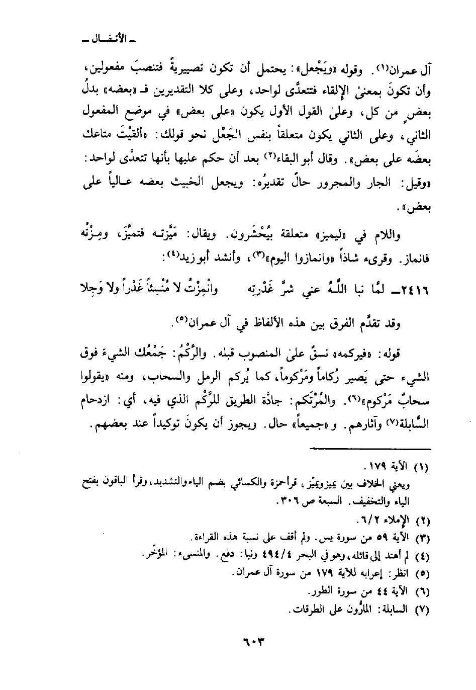 آل عمران. وقوله: «ويَجْعل» : يحتمل أن تكون تصييريةً فتنصبَ مفعولين، وأن تكونَ بمعنى الإِلقاء فتتعدَّى لواحد، وعلى كلا التقديرين ف «بعضه» بدلُ بعضٍ من كل، وعلى القول الأول يكون «على بعض» في موضع المفعول الثاني، وعلى الثاني يكون متعلقاً بنفس الجَعْل نحو قولك: «ألقيْتَ متاعك بعضَه على بعض» . وقال أبو البقاء بعد أن حكم عليها بأنها تتعدَّى لواحد: «وقيل: الجار والمجرور حالٌ تقديرُه: ويجعل الخبيث بعضه عالياً على بعض» .