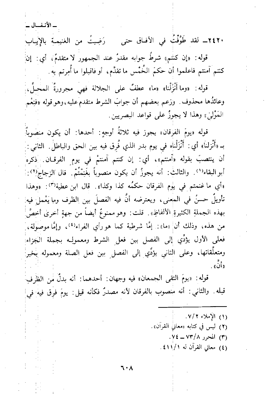 قوله {يَوْمَ الفرقان} يجوز فيه ثلاثةُ أوجهٍ: أحدها: أن يكون منصوباً ب «أَنْزلنا» أي: أَنْزَلْناه في يوم بدر الذي فُرِق فيه بين الحق والباطل. الثاني: أن ينتصبَ بقوله «آمنتم» ، أي: إن كنتم آمنتمْ في يومِ الفرقان. ذكره أبو البقاء. والثالث: أنه يجوزُ أن يكون منصوباً بغَنِمْتُمْ. قال الزجاج: «أي ما غنمتم في يوم الفرقان حكمُه كذا وكذا» . قال ابن عطية: «وهذا تأويلٌ حسنٌ في المعنى، ويعترضه أنَّ فيه الفصلَ بين الظرف وما يَعْمل فيه بهذه الجملةِ الكثيرةِ الألفاظِ» . قلت: وهو ممنوعٌ أيضاً من جهةٍ أخرى أخصَّ من هذه، وذلك أن «ما» : إمَّا شرطية كما هو رأي الفراء، وإمَّا موصولة، فعلى الأول يؤدِّي إلى الفصل بين فعلِ الشرط ومعموله بجملة الجزاء ومتعلَّقاتها، وعلى الثاني يؤدِّي إلى الفصلِ بين فعل الصلة ومعموله بخبر «أنَّ» .
