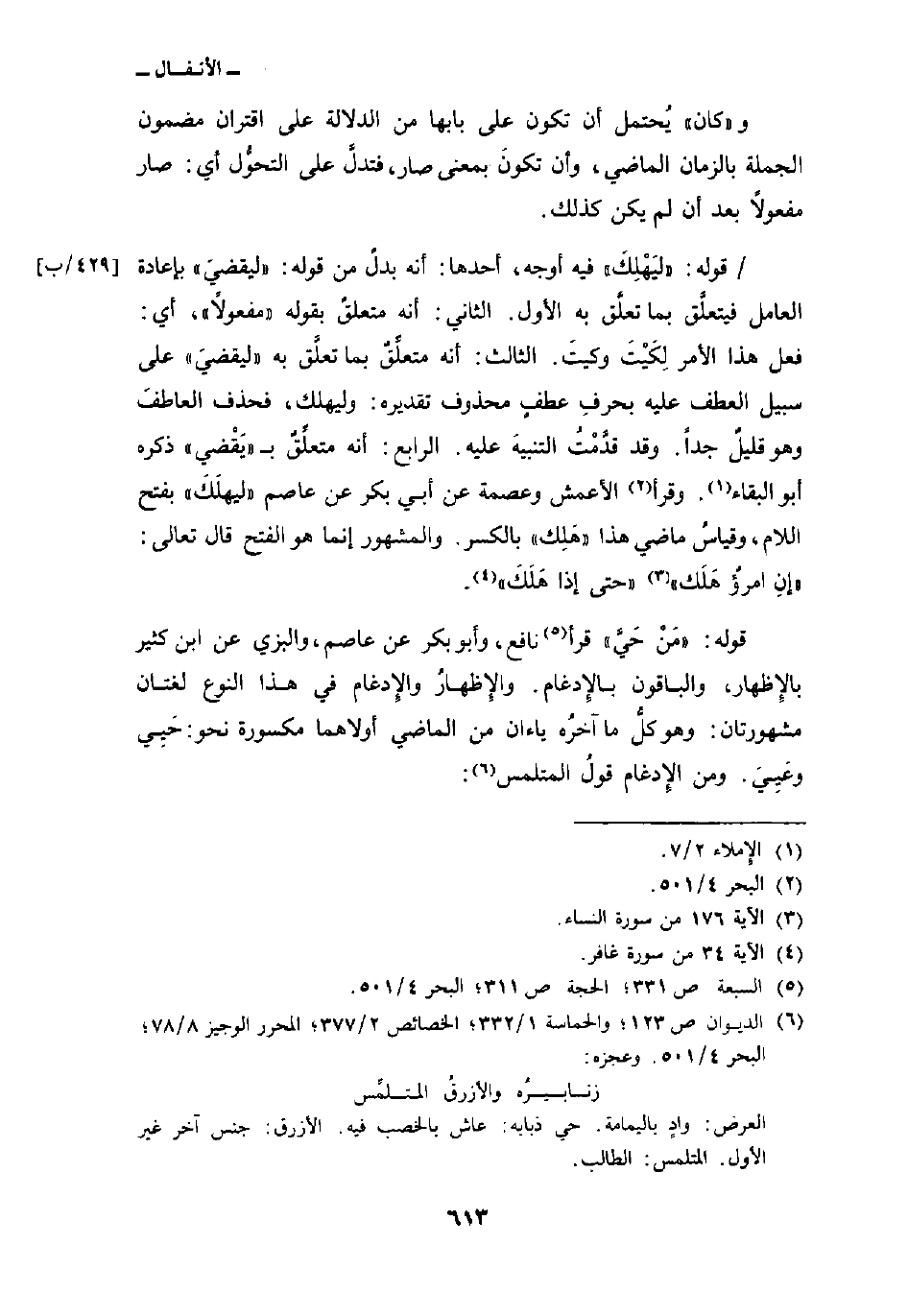 الثاني: أنه متعلقٌ بقوله «مفعولاً» ، أي: فعل هذا الأمر لِكَيْتَ وكيتَ. الثالث: أنه متعلِّقٌ بما تعلَّق به «ليقضيَ» على سبيل العطف عليه بحرفِ عطفٍ محذوف تقديره: وليهلك، فحذف العاطفَ وهو قليلٌ جداً. وقد قدَّمْتُ التنبيهَ عليه. الرابع: أنه متعلِّقٌ ب «يَقْضي» ذكره أبو البقاء. وقرأ الأعمش وعصمة عن أبي بكر عن عاصم «ليهلَكَ» بفتح اللام، وقياسُ ماضي هذا «هَلِك» بالكسر. والمشهور إنما هو الفتح قال تعالى: {إِن امرؤ هَلَكَ} [النساء: 176] {حتى إِذَا هَلَكَ} [غافر: 34] .