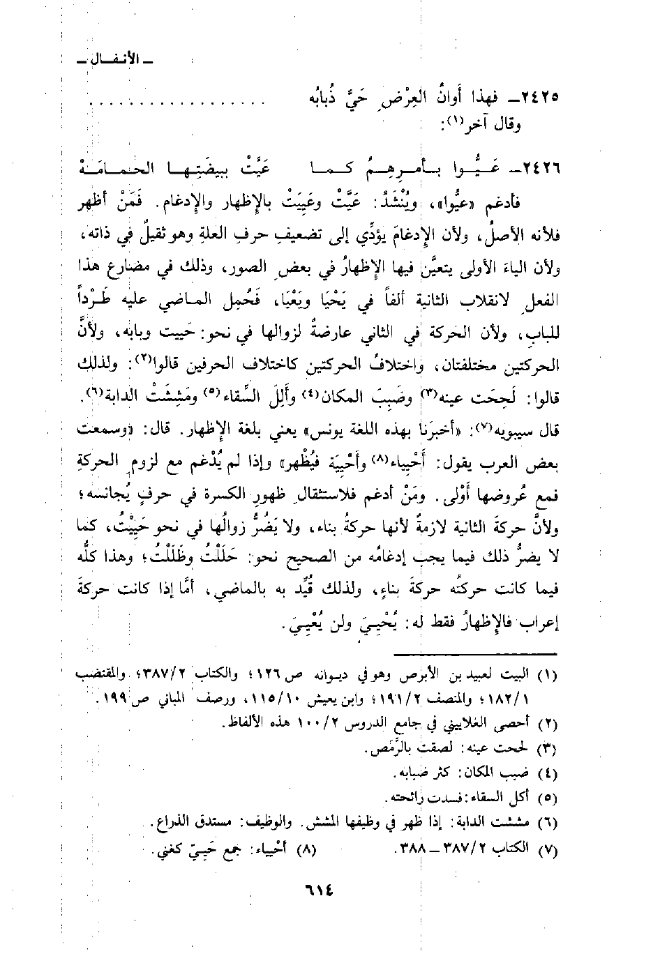 فأدغم «عيُّوا» ، ويُنْشَدُ: عَيَّتْ وعَيِيَتْ بالإِظهار والإِدغام. فَمَنْ أظهر فلأنه الأصلُ، ولأن الإِدغامَ يؤدِّي إلى تضعيفِ حرفِ العلةِ وهو ثقيلٌ في ذاته، ولأن الياءَ الأولى يتعيَّن فيها الإظهارُ في بعضِ الصور، وذلك في مضارع هذا الفعلِ لانقلاب الثانية ألفاً في يَحْيَا ويَعْيَا، فَحُمِل الماضي عليه طَرْداً للبابِ، ولأن الحركة في الثاني عارضةٌ لزوالها في نحو: حَييت وبابه، ولأنَّ الحركتين مختلفتان، واختلافُ الحركتين كاختلاف الحرفين قالوا: ولذلك قالوا: لَحِحَت عينه وضَبِبَ المكان وأَلِلَ السِّقاء ومَشِشَتْ الدابة. قال سيبويه: «أخبرَنا بهذه اللغة يونس» يعني بلغة الإِظهار. قال: «وسمعت بعض العرب يقول: أَحْيِياء وأَحْيِيَة فيُظْهر» وإذا لم يُدْغم مع لزومِ الحركةِ فمع عُروضها أَوْلى. ومَنْ أدغم فلاستثقالِ ظهرِ الكسرة في حرفٍ يُجانسه؛ ولأنَّ حركةَ الثانية لازمةٌ لأنها حركةُ بناء، ولا يَضُرُّ زوالُها في نحو حَيِيْتُ، كما لا يضرُّ ذلك فيما يجب إدغامُه من الصحيح نحو: حَلَلْتُ وظَلَلْتُ؛ وهذا كلُّه فيما كانت حركتُه حركةَ بناءٍ، ولذلك قُيِّد به بالماضي، أمَّا إذا كانت حركةَ إعراب فالإِظهارُ فقط له: يُحْيِيَ ولن يُعْيِيَ.