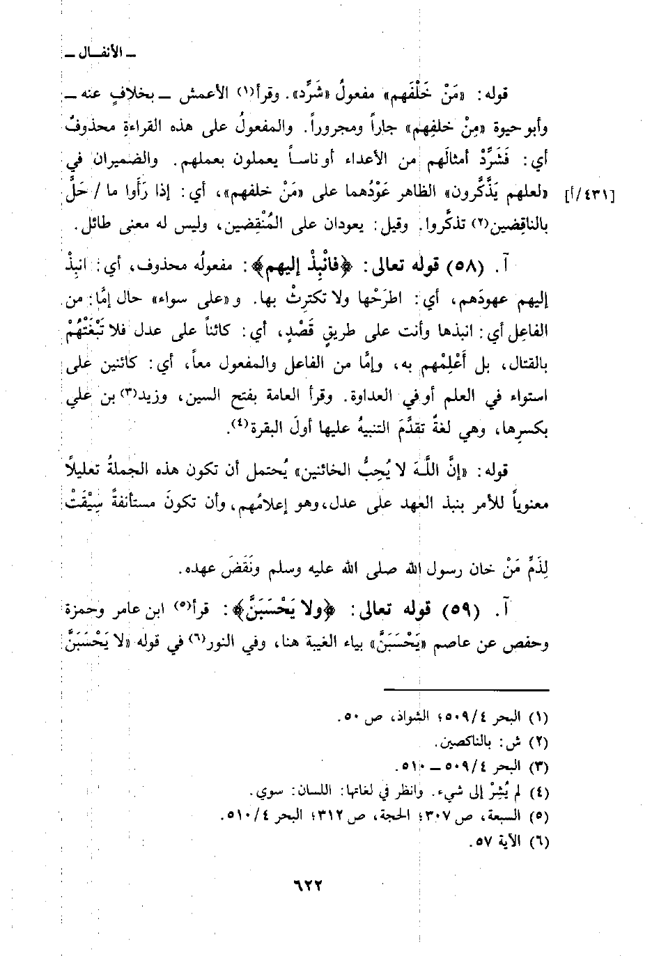 قوله: {إِنَّ الله لاَ يُحِبُّ الخائنين} يُحتمل أن تكون هذه الجملةُ تعليلاً معنوياً للأمر بنبذ العهد على عدل، وهو إعلامُهم، وأن تكونَ مستأنفةً سِيْقَتْ لِذَمِّ مَنْ خان رسول الله صَلَّى اللهُ عَلَيْهِ وَسَلَّمَ ونَقَضَ عهده.