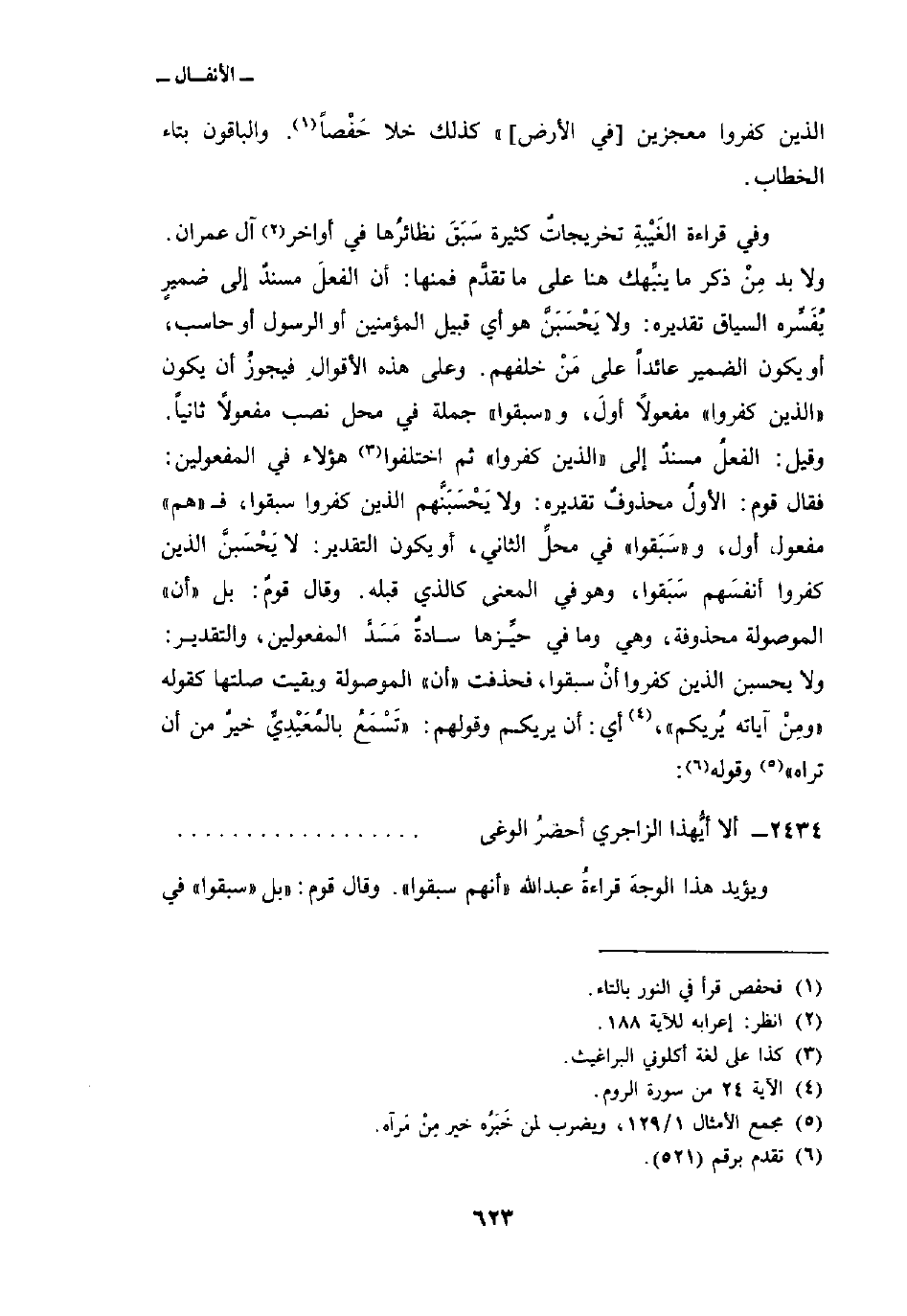 وفي قراءة الغَيْبةِ تخريجاتٌ كثيرة سَبَقَ نظائرُها في أواخر آل عمران. ولا بد مِنْ ذكر ما ينبِّهك هنا على ما تقدَّم فمنها: أن الفعلَ مسندٌ إلى ضميرٍ يُفَسِّره السياق تقديره: ولا يَحْسَبَنَّ هو أي قبيل المؤمنين أو الرسول أو حاسب، أو يكون الضمير عائداً على مَنْ خلفهم. وعلى هذه الأقوالِ فيجوزُ أن يكون «الذين كفروا» مفعولاً أولَ، و «سبقوا» جملة في محل نصب مفعولاً ثانياً. وقيل: الفعلُ مسندٌ إلى «الذين كفروا» ثم اختلفوا هؤلاء في المفعولين: فقال قوم: الأولُ محذوفٌ تقديره: ولا يَحْسَبَنَّهم الذين كفروا سبقوا، ف «هم» مفعول أول، و «سَبَقوا» في محلِّ الثاني، أو يكون التقدير: لا يَحْسَبنَّ الذين كفروا أنفسَهم سَبَقوا، وهو في المعنى كالذي قبله. وقال قومٌ: بل «أن» الموصولة محذوفة، وهي وما في حيِّزها سادةٌ مَسَدَّ المفعولين، والتقدير: ولا يحسبن الذين كفروا أنْ سبقوا، فحذفت «أن» الموصولة وبقيت صلتها كقوله {وَمِنْ آيَاتِهِ يُرِيكُمُ} [الروم: 24] ، أي: أن يريكم وقولهم: «تَسْمَعُ بالمُعَيْدِيِّ خيرٌ من أن تراه» وقوله: