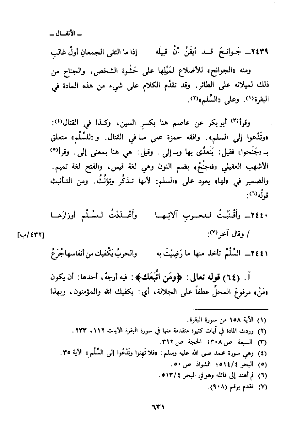 وقرأ أبو بكر عن عاصم هنا بكسرِ السين، وكذا في القتال: {وتدعوا إِلَى السلم} . وافقه حمزة على ما في القتال. و «للسِّلْم» متعلق ب «جَنَحوا» فقيل: يَتَعدَّى بها وب إلى. وقيل: هي هنا بمعنى إلى. وقرأ الأشهب العقيلي «فاجنُحْ» بضم النون وهي لغة قيس، والفتح لغة تميم. والضمير في «لها» يعود على «السلم» لأنها تذكَّر وتؤنَّثُ. ومن التأنيث قولُه: