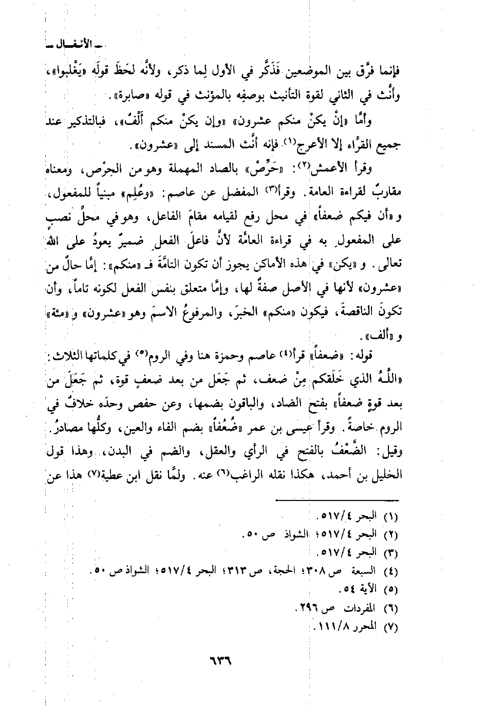 وقرأ الأعمش:» حَرِّصْ «بالصاد المهملة وهو من الحِرْص، ومعناه مقاربٌ لقراءة العامة. وقرأ المفضل عن عاصم:» وعُلِم «مبنياً للمفعول، و» أن فيكم ضعفاً «في محل رفع لقيامه مقامَ الفاعل، وهو في محلِّ نصبٍ على المفعولِ به في قراءة العامَّة لأنَّ فاعلَ الفعلِ ضميرٌ يعودُ على الله تعالى. و» يكن «في هذه الأماكن يجوز أن تكون التامَّةَ ف» منكم «: إمَّا حالٌ من» عشرون «لأنها في الأصل صفةٌ لها، وإمَّا متعلق بنفس الفعل لكونه تاماً، وأن تكونَ الناقصةَ، فيكون» منكم «الخبرَ، والمرفوعُ الاسمَ وهو» عشرون «و» مئة «و» ألف «.