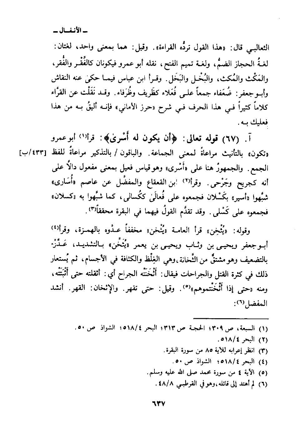 قوله تعالى: {أَن يَكُونَ لَهُ أسرى} : قرأ أبو عمرو «تكون» بالتأنيث مراعاةً لمعنى الجماعة. والباقون/ بالتذكير مراعاةً للفظ الجمع. والجمهورُ هنا على «أَسْرى» وهو قياس فعيل بمعنى مفعول دالاَّ على أنه كجريح وجَرْحى. وقرأ ابن القعقاع والمفضَّل عن عاصم «أُسَارى» شبَّهوا «أسير» بكَسْلان فجمعوه على فُعالَى ككُسالى، كما شبَّهوا به «كسلان» فجمعوه على كَسْلى. وقد تقدَّم القولُ فيهما في البقرة محققاً.