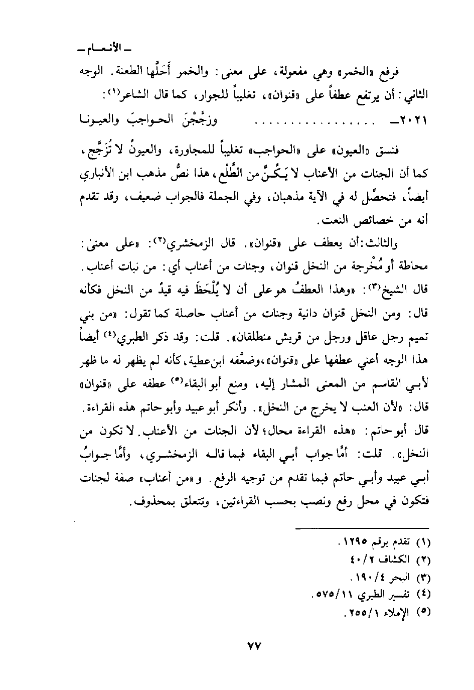 فرفع «الخمر» وهي مفعولة، على معنى: والخمر أَحَلَّها الطعنة. الوجه الثاني: أن يرتفع عطفاً على «قنوان» ، تغليباً للجوار، كما قال الشاعر: