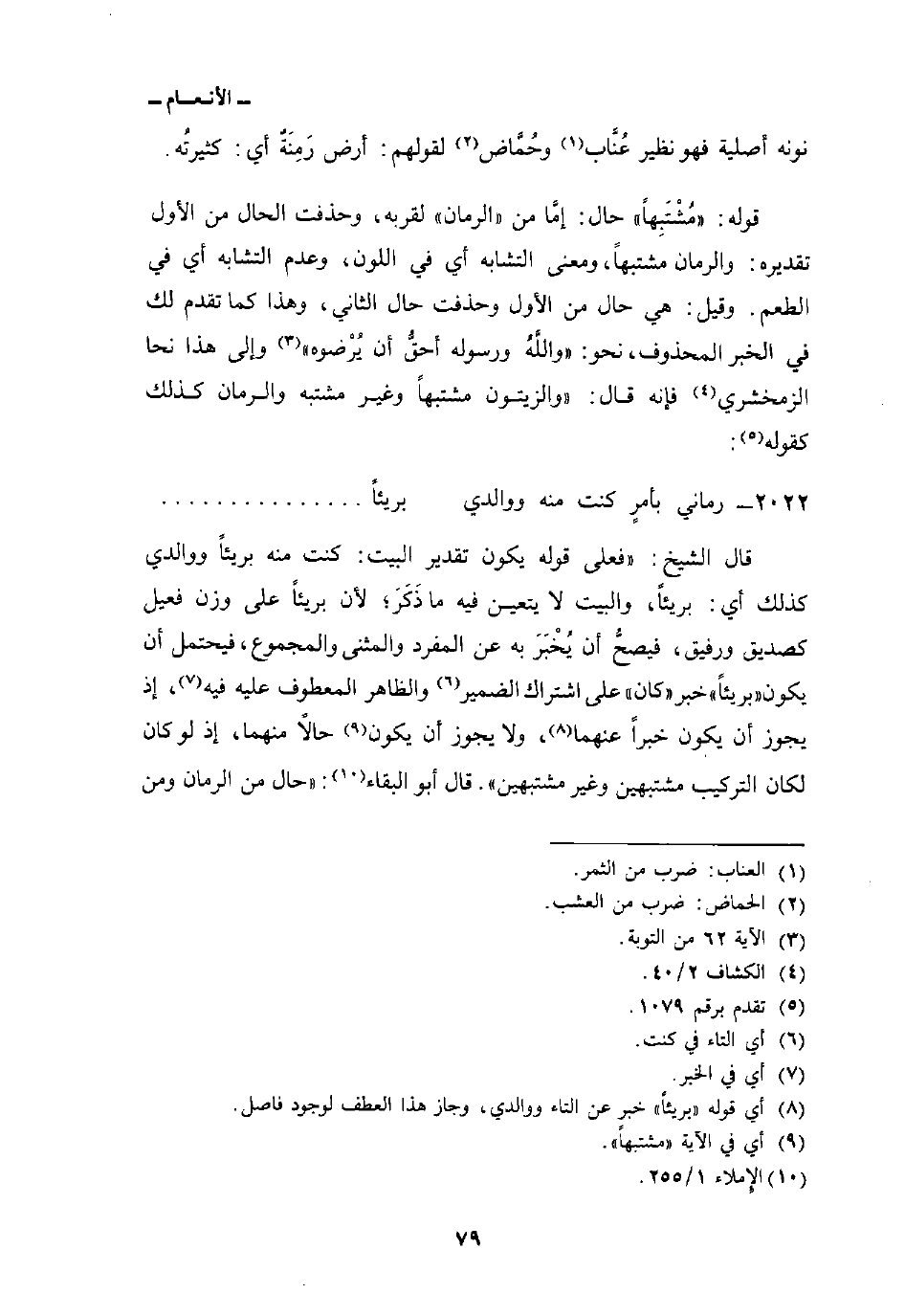 قال الشيخ: «فعلى قوله يكون تقدير البيت: كنت منه بريئاً ووالدي كذلك أي: بريئاً، والبيت لا يتعين فيه ما ذَكَرَ؛ لأن بريئاً على وزن فعيل كصديق ورفيق، فيصحُّ أن يُخْبَرَ به عن المفرد والمثنى والمجموع، فيحتمل أن يكون» بريئاً «خبر» كان «على اشتراك الضمير والظاهر المعطوف عليه فيه، إذ يجوز أن يكون خبراً عنهما، ولا يجوز أن يكون حالاً منهما، إذ لو كان لكان التركيب مشتبهين وغير مشتبهين» . قال أبو البقاء: «حال من الرمان ومن