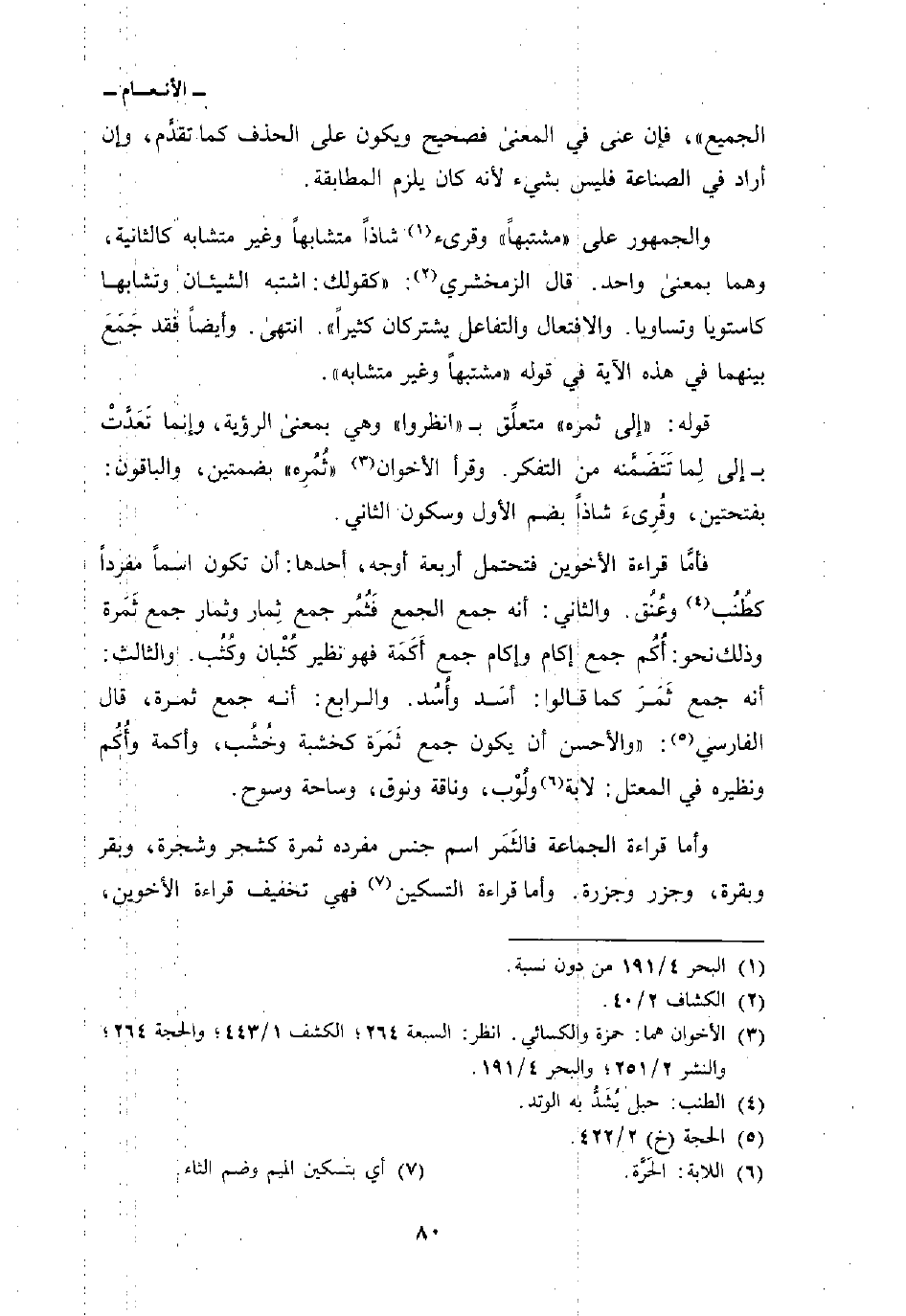 فأمَّا قراءة الأخوين فتحتمل أربعة أوجه، أحدها: أن تكون اسماً مفرداً كطُنُب وعُنُق. والثاني: أنه جمع الجمع فَثُمُر جمع ثِمار وثمار جمع ثَمَرة وذلك نحو: أُكُم جمع إكام وإكام جمع أَكَمَة فهو نظير كُثْبان وكُثُب. والثالث: أنه جمع ثَمَرَ كما قالوا: أسَد وأُسُد. والرابع: أنه جمع ثمرة، قال الفارسي: «والأحسن أن يكون جمع ثَمَرَة كخشبة وخُشُب، وأكمة وأُكُم ونظيره في المعتل: لابة ولُوْب، وناقة ونوق، وساحة وسوح.