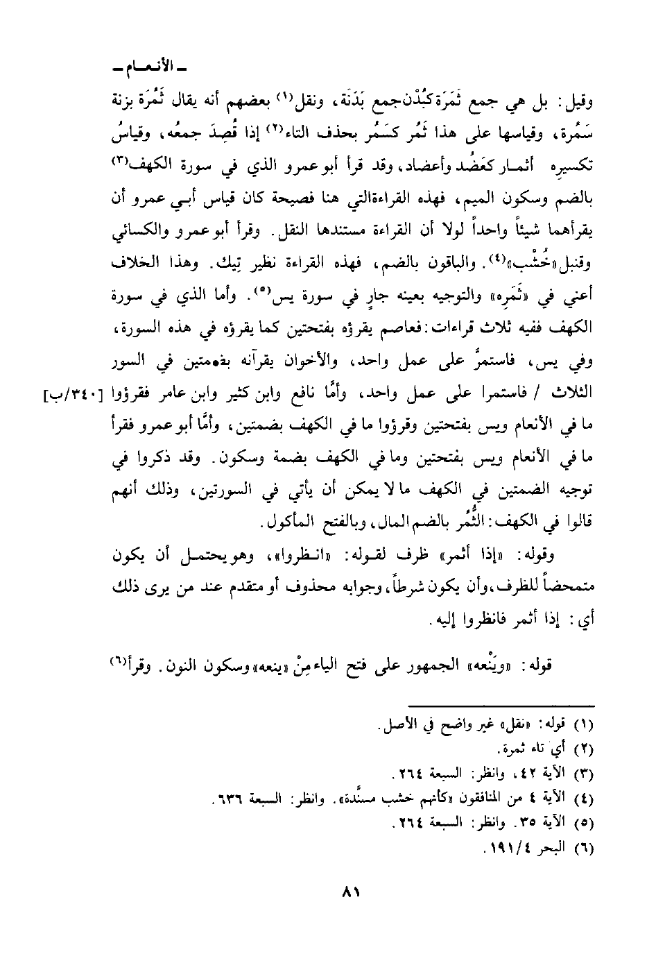 وقيل: بل هي جمع ثَمَرَة كبُدْن جمع بَدَنَة، ونقل بعضهم أنه يقال ثَمُرَة بزنة سَمُرة، وقياسها على هذا ثَمُر كسَمُر بحذف التاء إذا قُصِدَ جمعُه، وقياسُ تكسيرِه أثمار كعَضُد وأعضاد، وقد قرأ أبو عمرو الذي في سورة الكهف بالضم وسكون الميم، فهذه القراءة التي هنا فصيحة كان قياس أبي عمرو أن يقرأهما شيئاً واحداً لولا أن القراءة مستندها النقل. وقرأ أبو عمرو والكسائي وقنبل» خُشْب «. والباقون بالضم، فهذه القراءة نظير تِيك. وهذا الخلاف أعني في» ثَمَرِه «والتوجيه بعينه جارٍ في سورة يس. وأما الذي في سورة الكهف ففيه ثلاث قراءات: فعاصم يقرؤه بفتحتين كما يقرؤه في هذه السورة، وفي يس، فاستمرَّ على عمل واحد، والأخوان يقرآنه بضمتين في السور الثلاث/ فاستمرا على عمل واحد، وأمَّا نافع وابن كثير وابن عامر فقرؤوا ما في الأنعام ويس بفتحتين وقرؤوا ما في الكهف بضمتين، وأمَّا أبو عمرو فقرأ ما في الأنعام ويس بفتحتين وما في الكهف بضمة وسكون. وقد ذكروا في توجيه الضمتين في الكهف ما لا يمكن أن يأتي في السورتين، وذلك أنهم قالوا في الكهف: الثُّمُر بالضم المال، وبالفتح المأكول.