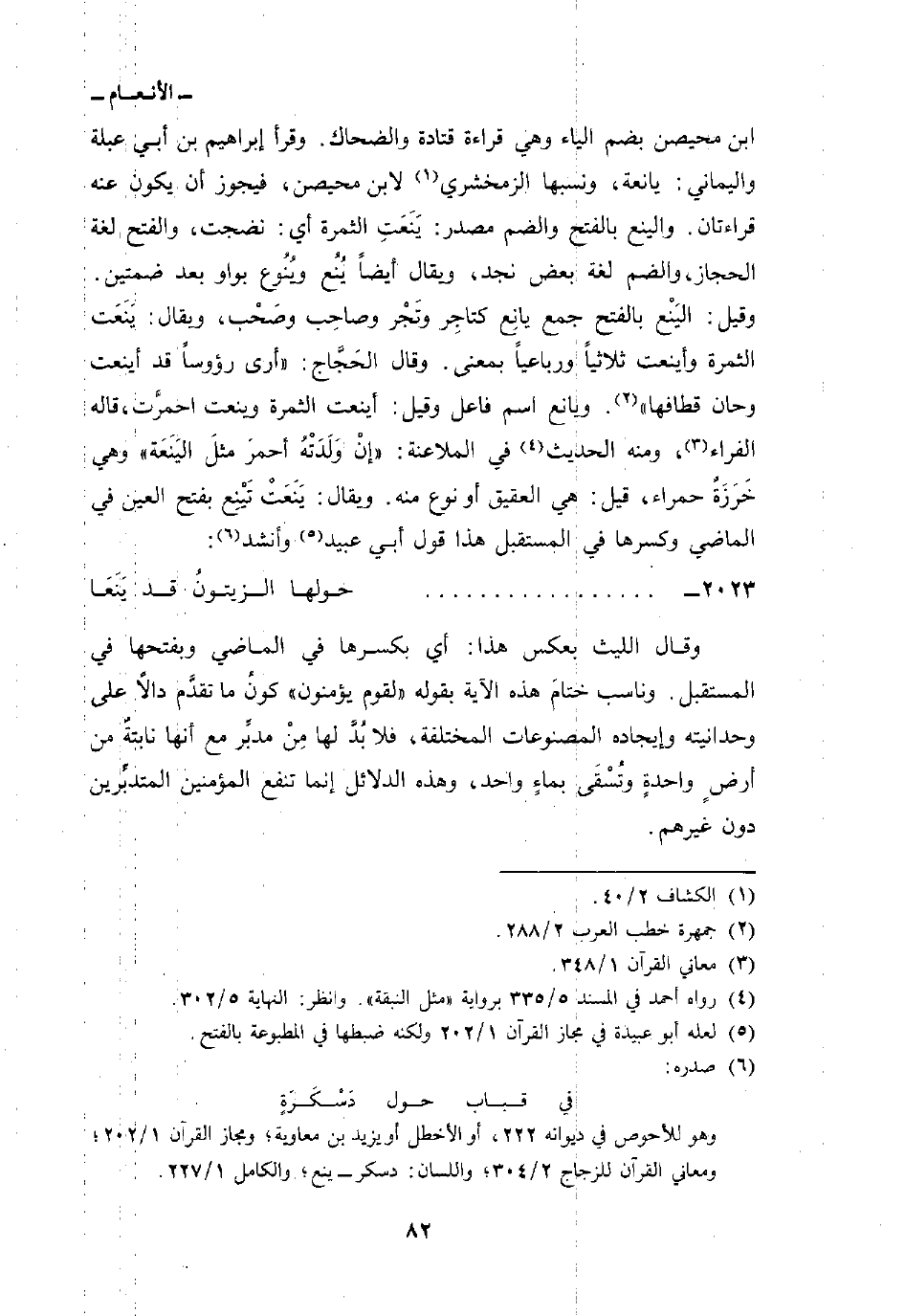وقال الليث بعكس هذا: أي بكسرها في الماضي وبفتحها في المستقبل. وناسب ختامَ هذه الآية بقوله «لقوم يؤمنون» كونُ ما تقدَّم دالاً على وحدانيته وإيجاده المصنوعات المختلفة، فلا بُدَّ لها مِنْ مدبِّر مع أنها نابتةٌ من أرضٍ واحدةٍ وتُسْقَى بماءٍ واحد، وهذه الدلائل إنما تنفع المؤمنين المتدبِّرين دون غيرهم.