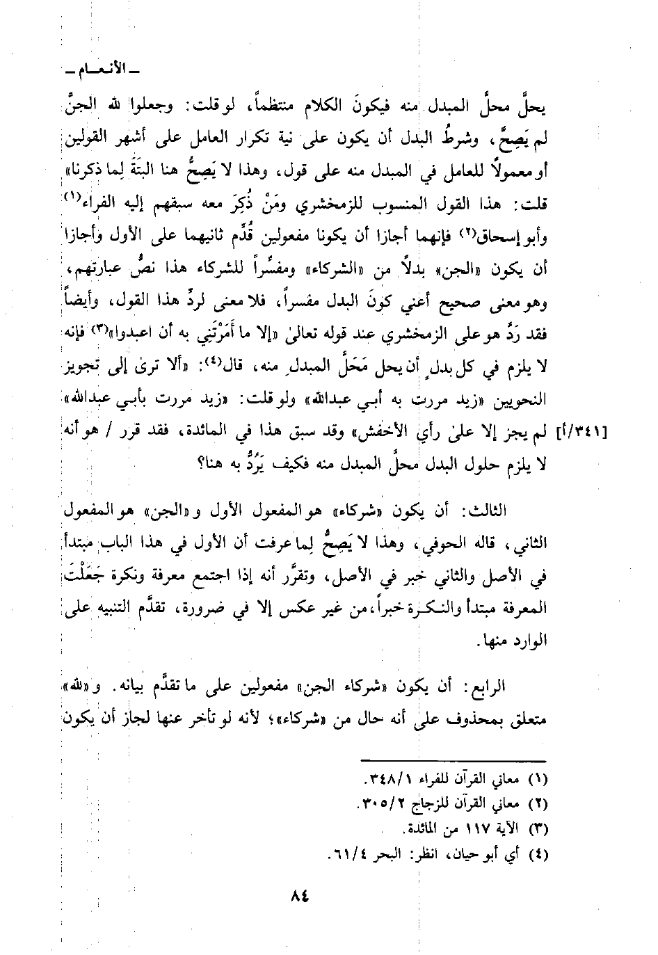 يحلَّ محلَّ المبدل منه فيكونَ الكلام منتظماً، لو قلت: وجعلوا لله الجنَّ لم يَصِحَّ، وشرطُ البدل أن يكون على نية تكرار العامل على أشهر القولين أو معمولاً للعامل في المبدل منه على قول، وهذا لا يَصِحُّ هنا البتَةَ لِما ذكرنا «قلت: هذا القول المنسوب للزمخشري ومَنْ ذُكِرَ معه سبقهم إليه الفراء وأبو إسحاق فإنهما أجازا أن يكونا مفعولين قُدِّم ثانيهما على الأول وأجازا أن يكون» الجن «بدلاً من» الشركاء «ومفسِّراً للشركاء هذا نصُّ عبارتهم، وهو معنى صحيح أعني كونَ البدل مفسراً، فلا معنى لردِّ هذا القول، وأيضاً فقد رَدَّ هو على الزمخشري عند قوله تعالى {إِلاَّ مَآ أَمَرْتَنِي بِهِ أَنِ اعبدوا} [المائدة: 117] فإنه لا يلزم في كل بدلٍ أن يحل مَحَلَّ المبدلِ منه، قال:» ألا ترى إلى تجويز النحويين «زيد مررت به أبي عبد الله» ولو قلت: «زيد مررت بأبي عبد الله» لم يجز إلا على رأي الأخفش «وقد سبق هذا في المائدة، فقد قرر/ هو أنه لا يلزم حلول البدل محلَّ المبدل منه فكيف يَرُدُّ به هنا؟