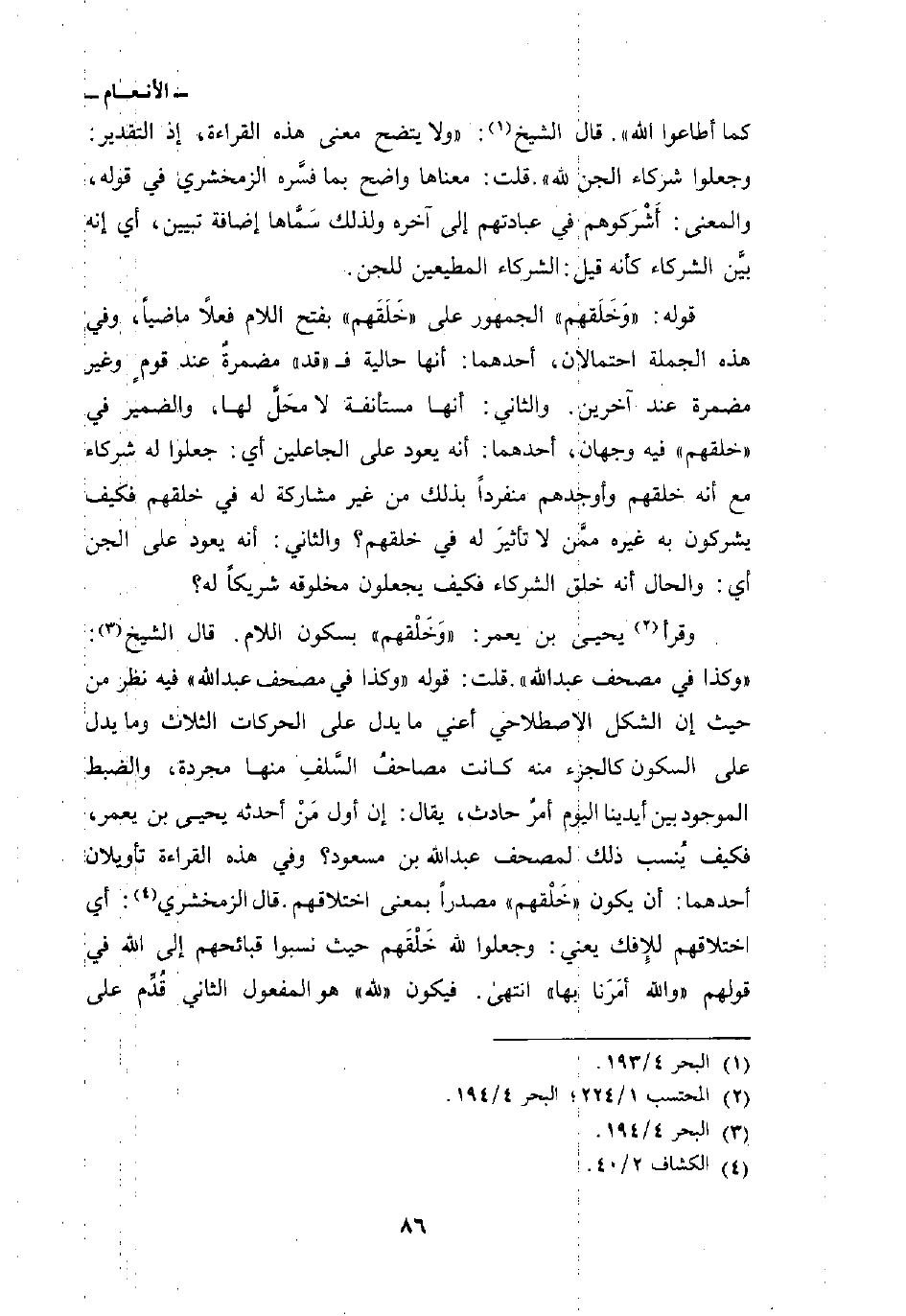 وقرأ يحيى بن يعمر: «وَخَلْقهم» بسكون اللام. قال الشيخ: «وكذا في مصحف عبد الله» . قلت: قوله «وكذا في مصحف عبد الله» فيه نظر من حيث إن الشكل الاصطلاحي أعني ما يدل على الحركات الثلاث وما يدل على السكون كالجزء منه كانت مصاحفُ السَّلفِ منها مجردة، والضبط الموجود بين أيدينا اليوم أمرٌ حادث، يقال: إن أول مَنْ أحدثه يحيى بن يعمر، فكيف يُنسب ذلك لمصحف عبد الله بن مسعود؟ وفي هذه القراءة تأويلان أحدهما: أن يكون «خَلْقهم» مصدراً بمعنى اختلاقهم. قال الزمخشري: أي اختلاقهم للإِفك يعني: وجعلوا لله خَلْقَهم حيث نسبوا قبائحهم إلى الله في قولهم «والله أمَرَنا بها» انتهى. فيكون «لله» هو المفعول الثاني قُدِّم على