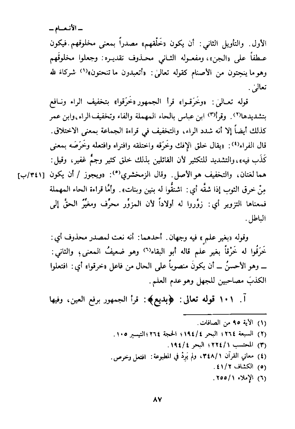 قوله تعالى: «وخَرَقوا» قرأ الجمهور «خَرَقوا» بتخفيف الراء ونافع بتشديدها. وقرأ ابن عباس بالحاء المهملة والفاء وتخفيف الراء، وابن عمر كذلك أيضاً إلا أنه شدد الراء، والتخفيف في قراءة الجماعة بمعنى الاختلاق. قال الفراء: «يقال خلق الإِفك وخَرَقه واختلقه وافتراه وافتعله وخَرَصَه بمعنى كَذَب فيه» ، والتشديد للتكثير لأن القائلين بذلك خلق كثير وجمٌّ غفير، وقيل: هما لغتان، والتخفيف هو الأصل. وقال الزمخشري: «ويجوز/ أن يكون مِنْ خرق الثوب إذا شقَّه أي: اشتقُّوا له بنين وبنات» . وأمَّا قراءة الحاء المهملة فمعناها التزوير أي: زوَّروا له أولاداً لأن المزوِّر محرِّف ومغيِّرٌ الحقَّ إلى الباطل.