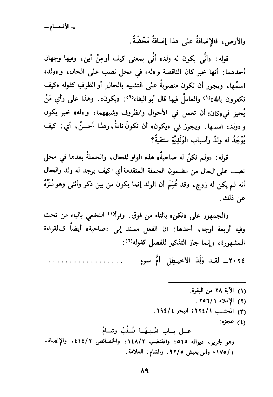 قوله: {أنى يَكُونُ لَهُ وَلَدٌ} أنَّى بمعنى كيف أو مِنْ أين، وفيها وجهان أحدهما: أنها خبر كان الناقصة و «له» في محل نصب على الحال، و «ولد» اسمُها، ويجوز أن تكون منصوبةً على التشبيه بالحالِ أو الظرفِ كقوله «كيف تكفرون بالله» والعاملُ فيها قال أبو البقاء: «يكون» ، وهذا على رأي مَنْ يُجيز في «كان» أن تعمل في الأحوال والظروف وشبههما، و «له» خبر يكون و «ولد» اسمها. ويجوز في «يكون» أن تكونَ تامةً، وهذا أحسنُ، أي: كيف يُوْجَدُ له ولدٌ وأسباب الوَلَدِيَّةِ منتفيةٌ؟