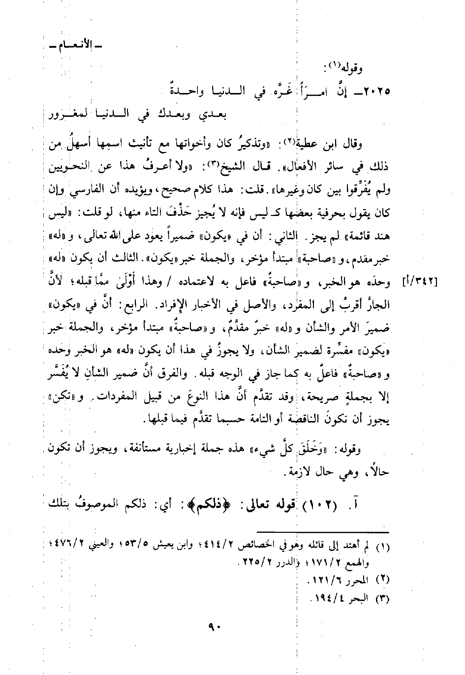 وقال ابن عطية: «وتذكيرُ كان وأخواتها مع تأنيث اسمِها أسهلُ من ذلك في سائر الأفعال» . قال الشيخ: «ولا أعرفُ هذا عن النحويين ولم يُفَرِّقوا بين كان وغيرها» . قلت: هذا كلام صحيح، ويؤيده أن الفارسي وإن كان يقول بحرفية بعضها ك ليس فإنه لا يُجيز حَذْفَ التاء منها، لو قلت: «ليس هند قائمة» لم يجز. الثاني: أن في «يكون» ضميراً يعود على الله تعالى، و «له» خبر مقدم، و «صاحبة» مبتدأ مؤخر، والجملة خبر «يكون» . الثالث أن يكون «له» وحدَه هو الخبر، و «صاحبةٌ» فاعل به لاعتماده/ وهذا أَوْلَى ممَّا قبله؛ لأنَّ الجارَّ أقربُ إلى المفرد، والأصل في الأخبار الإِفراد. الرابع: أنَّ في «يكون» ضميرَ الأمر والشأن و «له» خبرٌ مقدَّمٌ، و «صاحبةٌ» مبتدأ مؤخر، والجملة خبر «يكون» مفسِّرة لضمير الشأن، ولا يجوزُ في هذا أن يكون «له» هو الخبر وحده و «صاحبةٌ» فاعلٌ به كما جاز في الوجه قبله. والفرق أنَّ ضمير الشأنِ لا يُفَسَّر إلا بجملةٍ صريحة، وقد تقدَّم أنَّ هذا النوعَ من قبيل المفردات. و «تكن» يجوز أن تكونَ الناقصة أو التامة حسبما تقدَّم فيما قبلها.