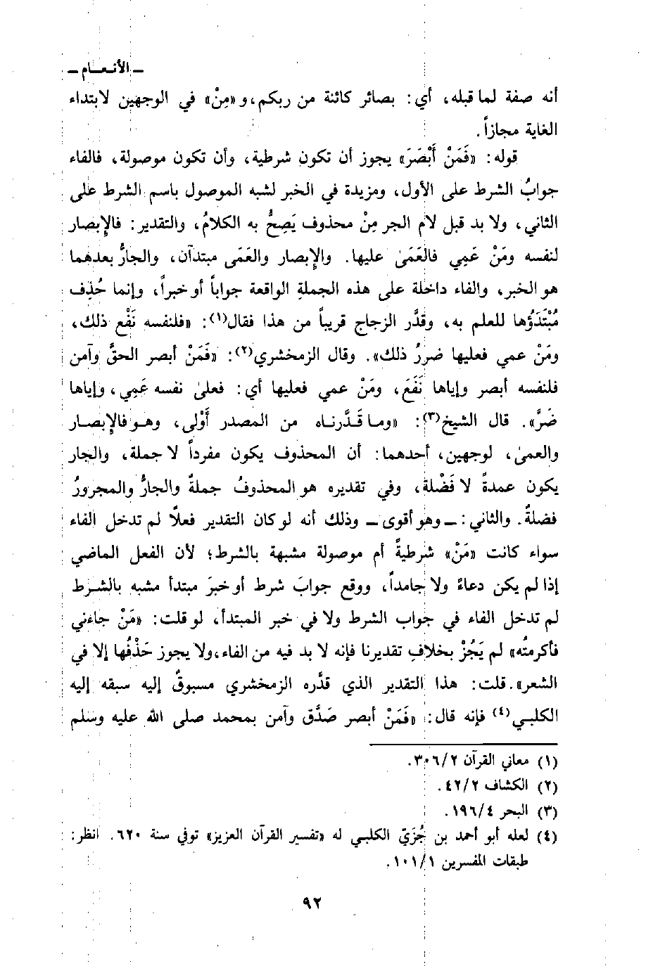 قوله: {فَمَنْ أَبْصَرَ} يجوز أن تكون شرطية، وأن تكون موصولة، فالفاء جوابُ الشرط على الأول، ومزيدة في الخبر لشبه الموصول باسم الشرط على الثاني، ولا بد قبل لام الجر مِنْ محذوف يَصِحُّ به الكلامُ، والتقدير: فالإِبصار لنفسه ومَنْ عَمِي فالعَمَى عليها. والإِبصار والعَمَى مبتدآن، والجارُّ بعدهما هو الخبر، والفاء داخلة على هذه الجملةِ الواقعة جواباً أو خبراً، وإنما حُذِف مُبْتَدَؤُها للعلم به، وقدَّر الزجاج قريباً من هذا فقال:» فلنفسه نَفْع ذلك، ومَنْ عمي فعليها ضررُ ذلك «. وقال الزمخشري:» فَمَنْ أبصر الحقَّ وآمن فلنفسه أبصر وإياها نَفَعَ، ومَنْ عمي فعليها أي: فعلى نفسه عَمِي، وإياها ضَرَّ «. قال الشيخ:» وما قَدَّرناه من المصدر أَوْلى، وهو فالإِبصار والعمى، لوجهين، أحدهما: أن المحذوف يكون مفرداً لا جملة، والجار يكون عمدةً لا فَضْلة، وفي تقديره هو المحذوفُ جملةٌ والجارُّ والمجرورُ فضلةٌ. والثاني: وهو أقوى وذلك أنه لو كان التقدير فعلاً لم تدخل الفاء سواء كانت «مَنْ» شرطيةً أم موصولة مشبهة بالشرط؛ لأن الفعل الماضي إذا لم يكن دعاءً ولا جامداً، ووقع جوابَ شرط أو خبرَ مبتدأ مشبه بالشرط لم تدخل الفاء في جواب الشرط ولا في خبر المبتدأ، لو قلت: «مَنْ جاءني فأكرمتُه» لم يَجُزْ بخلافِ تقديرنا فإنه لا بد فيه من الفاء، ولا يجوز حَذْفُها إلا في الشعر «. قلت: هذا التقدير الذي قدَّره الزمخشري مسبوقٌ إليه سبقه إليه الكلبي فإنه قال:» فَمَنْ أبصر صَدَّق وآمن بمحمد صَلَّى اللهُ عَلَيْهِ وَسَلَّمَ