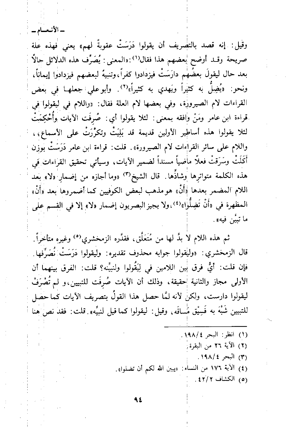 وقيل: إنه قصد بالتصريف أن يقولوا دَرَسَتْ عقوبةً لهم «يعني فهذه علة صريحة وقد أوضح بعضهم هذا فقال:» المعنى: يُصَرِّف هذه الدلائل حالاً بعد حال ليقولَ بعضُهم دارَسَتْ فيزدادوا كفراً، وتنبيهٌ لبعضهم فيزدادوا إيماناً، ونحو: {يُضِلُّ بِهِ كَثِيراً وَيَهْدِي بِهِ كَثِيراً} [البقرة: 2] . وأبو علي جعلها في بعض القراءات لام الصيرورة، وفي بعضها لام العلة فقال: «واللام في ليقولوا في قراءة ابن عامر ومَنْ وافقه بمعنى: لئلا يقولوا أي: صُرِفَت الآيات وأُحْكِمَتْ لئلا يقولوا هذه أساطير الأولين قديمة قد بَلِيَتْ وتكرَّرَتْ على الأسماع، واللام على سائر القراءات لام الصيرورة» . قلت: قراءة ابن عامر دَرَسَتْ بوزن أَكَلَتْ وسَرَقتْ فعلاً ماضياً مسنداً لضمير الآيات، وسيأتي تحقيق القراءات في هذه الكلمة متواتِرها وشاذِّها. قال الشيخ «وما أجازه من إضمارِ» لا «بعد اللام المضمر بعدها» أَنْ «هو مذهب لبعض الكوفيين كما أضمروها بعد» أَنْ «المظهرة في {أَن تَضِلُّواْ} [النساء: 176] ، ولا يجيز البصريون إضمار» لا «إلا في القسم على ما تبيَّن فيه» .