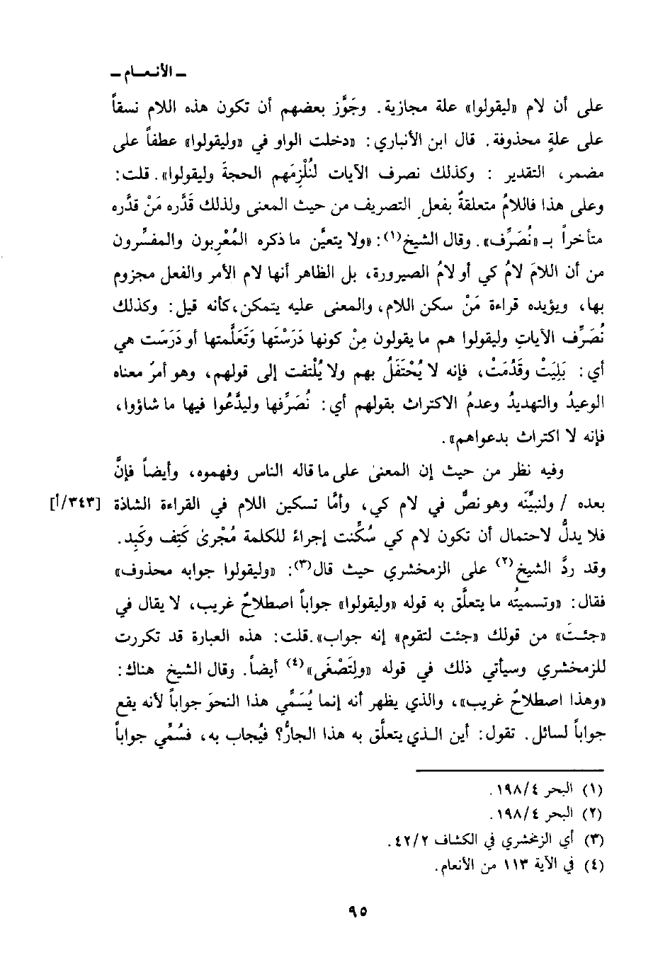 وفيه نظر من حيث إن المعنى على ما قاله الناس وفهموه، وأيضاً فإنَّ بعده/ ولنبيِّنَه وهو نصٌّ في لام كي، وأمَّا تسكين اللام في القراءة الشاذة فلا يدلُّ لاحتمال أن تكون لام كي سُكِّنت إجراءً للكلمة مُجْرى كَتِف وكَبِد. وقد ردَّ الشيخ على الزمخشري حيث قال: «وليقولوا جوابه محذوف» فقال: «وتسميتُه ما يتعلَّق به قوله» وليقولوا «جواباً اصطلاحٌ غريب، لا يقال في» جئتَ «من قولك» جئت لتقوم «إنه جواب» . قلت: هذه العبارة قد تكررت للزمخشري وسيأتي ذلك في قوله {ولتصغى} [الأنعام: 113] أيضاً. وقال الشيخ هناك: «وهذا اصطلاحٌ غريب» ، والذي يظهر أنه إنما يُسَمِّي هذا النحوَ جواباً لأنه يقع جواباً لسائل. تقول: أين الذي يتعلَّق به هذا الجارُّ؟ فيُجاب به، فسُمِّي جواباً