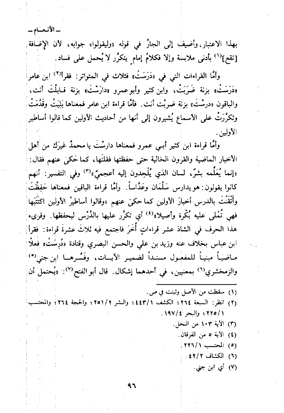 [الفرقان: 5] أي تكرَّر عليها بالدَّرْس ليحفظها. وقرئ هذا الحرف في الشاذ عشر قراءاتٍ أُخَرَ فاجتمع فيه ثلاثَ عشرةَ قراءة: فقرأ ابن عباس بخلاف عنه وزيد بن علي والحسن البصري وقتادة «دُرِسَتْ» فعلاً ماضياً مبنياً للمفعول مسنداً لضمير الآيات، وفَسَّرها ابن جني والزمخشري بمعنيين، في أحدهما إشكال. قال أبو الفتح: «يُحتمل أن