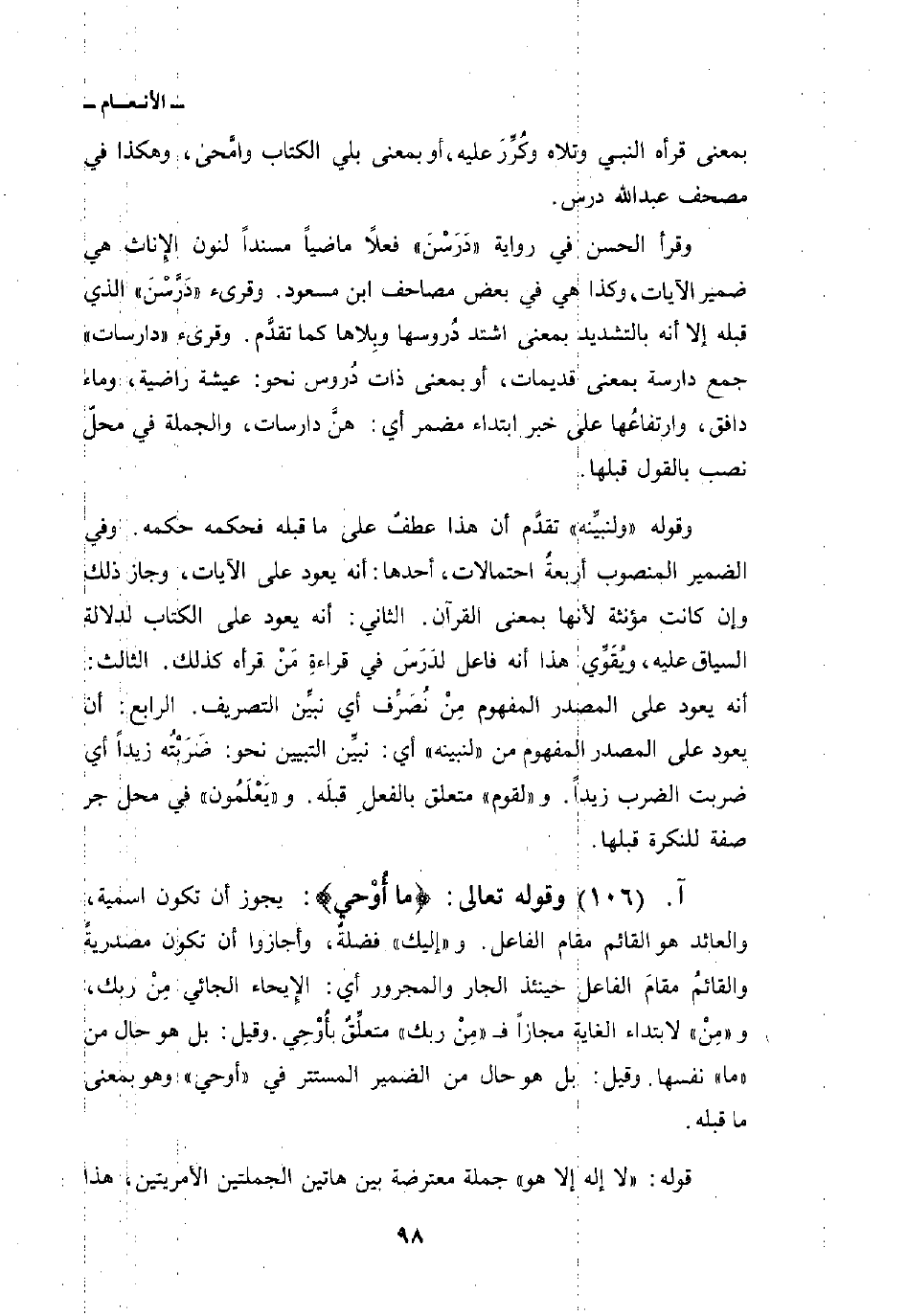 وقوله {وَلِنُبَيِّنَهُ} تقدَّم أن هذا عطفٌ على ما قبله فحكمه حكمه. وفي الضمير المنصوب أربعةُ احتمالات، أحدها: أنه يعود على الآيات، وجاز ذلك وإن كانت مؤنثة لأنها بمعنى القرآن. الثاني: أنه يعود على الكتاب لدلالة السياق عليه، ويُقَوِّي هذا أنه فاعل لدَرَسَ في قراءةِ مَنْ قرأه كذلك. الثالث: أنه يعود على المصدر المفهوم مِنْ نُصَرِّف أي نبيِّن التصريف. الرابع: أن يعود على المصدر المفهوم من «لنبينه» أي: نبيِّن التبيين نحو: ضَرَبْتُه زيداً أي ضربت الضرب زيداً. و «لقوم» متعلق بالفعلِ قبلَه. و «يَعْلَمُون» في محل جر صفة للنكرة قبلها.