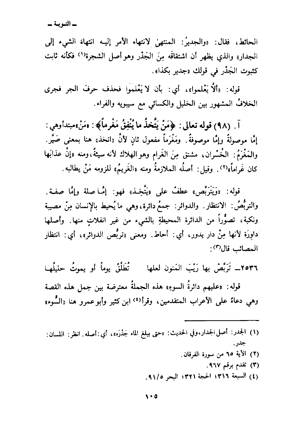 قوله: {وَيَتَرَبَّصُ} عطفٌ على «يَتَّخِذ» فهو: إمَّا صلة وإمَّا صفة. والتربُّصُ: الانتظار. والدوائر: جمعُ دائرة، وهي ما يُحيط بالإِنسان مِنْ مصيبة ونكبة، تصوُّراً من الدائرة المحيطةِ بالشيء من غير انفلاتٍ منها. وأصلها داوِرَة لأنها مِنْ دار يدور، أي: أحاط. ومعنى «تربُّص الدوائر» ، أي: انتظار المصائب قال: