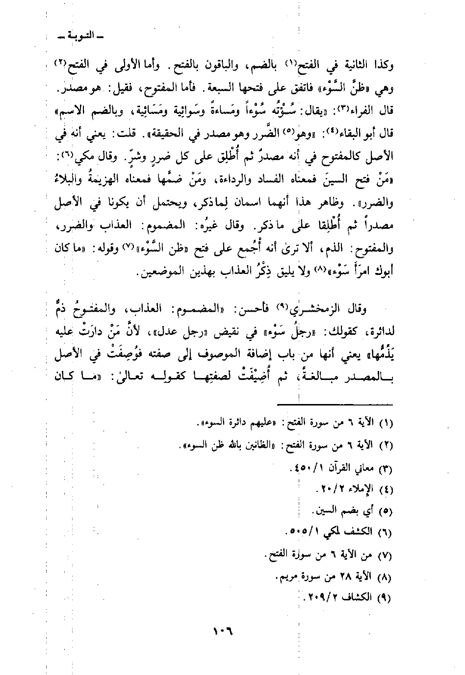 وقال الزمخشري فأحسن: «المضموم: العذاب، والمفتوحُ ذمٌّ لدائرة، كقولك:» رجلُ سَوْء «في نقيض» رجل عدل «، لأنَّ مَنْ دارَتْ عليه يَذُمُّها» يعني أنها من باب إضافة الموصووف إلى صفته فوُصِفَتْ في الأصل بالمصدر مبالغةً، ثم أُضِيْفَتْ لصفتِها كقولِه تعالى: {مَا كَانَ