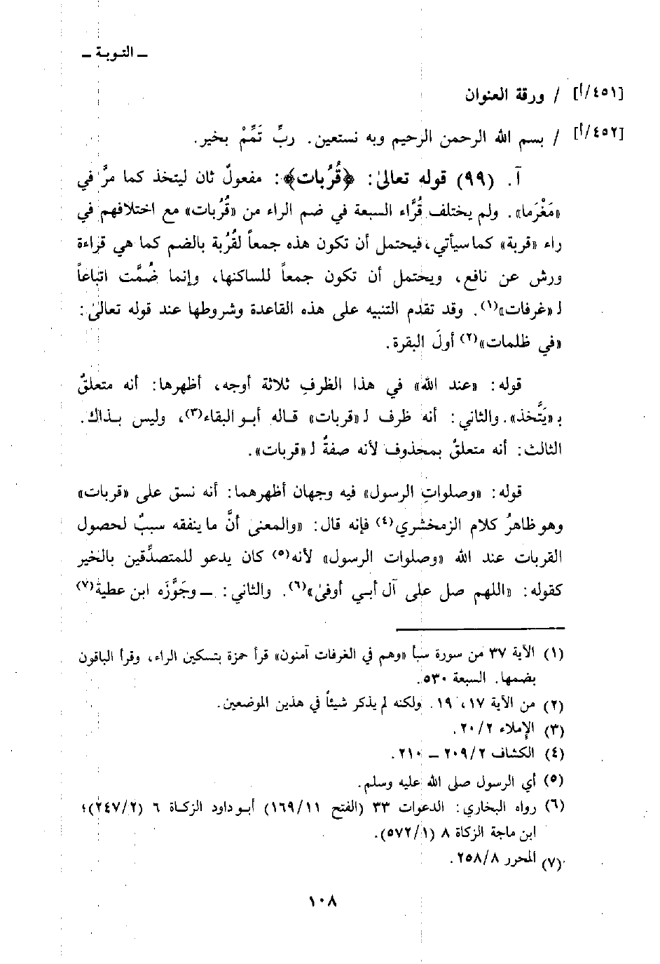 قوله تعالى: {قُرُبَاتٍ} : مفعولٌ ثان ليتخذ كما مرَّ في «مَغْرَما» . ولم يختلف قُرَّاء السبعة في ضم الراء من «قُرُبات» مع اختلافهم في راء «قربة» كما سيأتي، فيحتمل أن تكون هذه جمعاً لقُرُبة بالضم كما هي قراءة ورش عن نافع، ويحتمل أن تكون جمعاً للساكنها، وإنما ضُمَّت اتباعاً ل «غرفات» وقد تقدم التنبيه على هذه القاعدة وشروطها عند قوله تعالى {فِي ظُلُمَاتٍ} [الآية: 17] أولَ البقرة.
